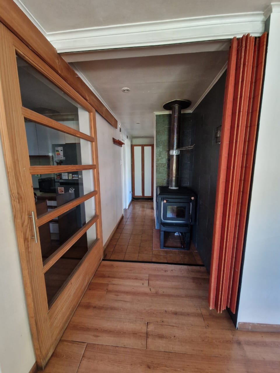 pasillo de distribución con estufa a combustión lenta.