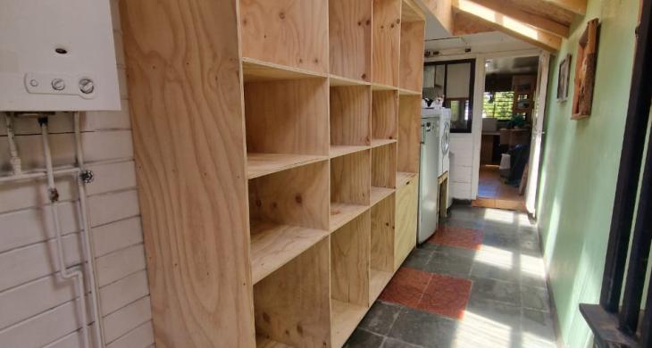 Amplia logia con estantería, lavadoras secadora.