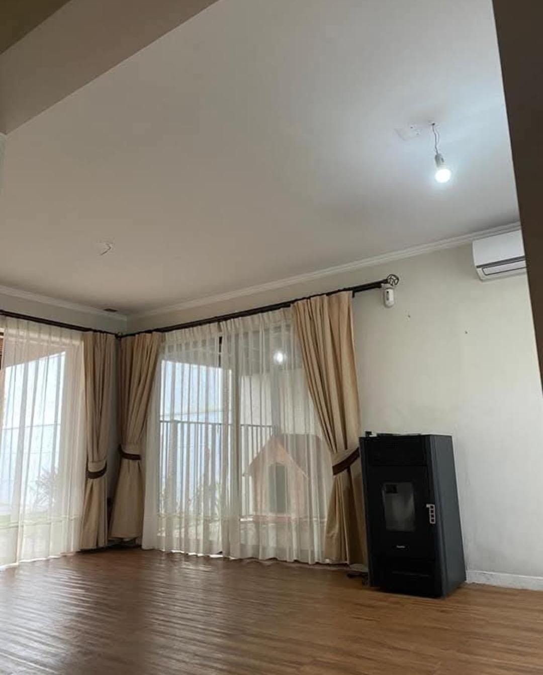 Living-comedor con aire acondicionado y estufa a pellet italiana.