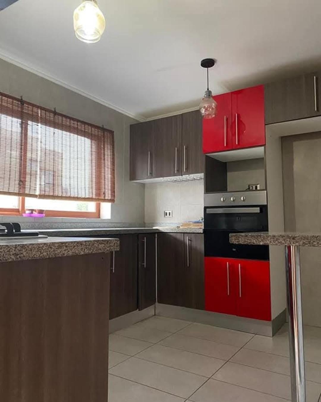 Cocina equipada con cubiertas de granito y comedor de diario.