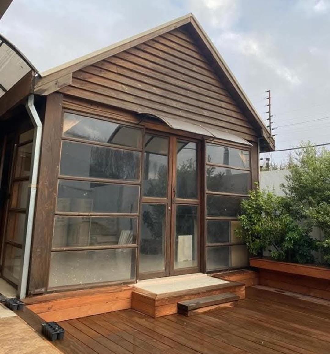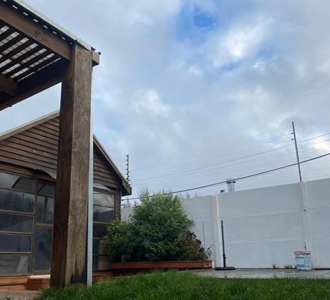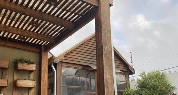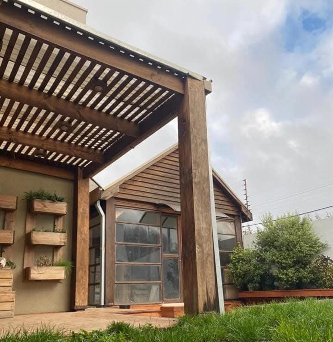 Jardín formado, terraza con madera nativa y bodega lateral.