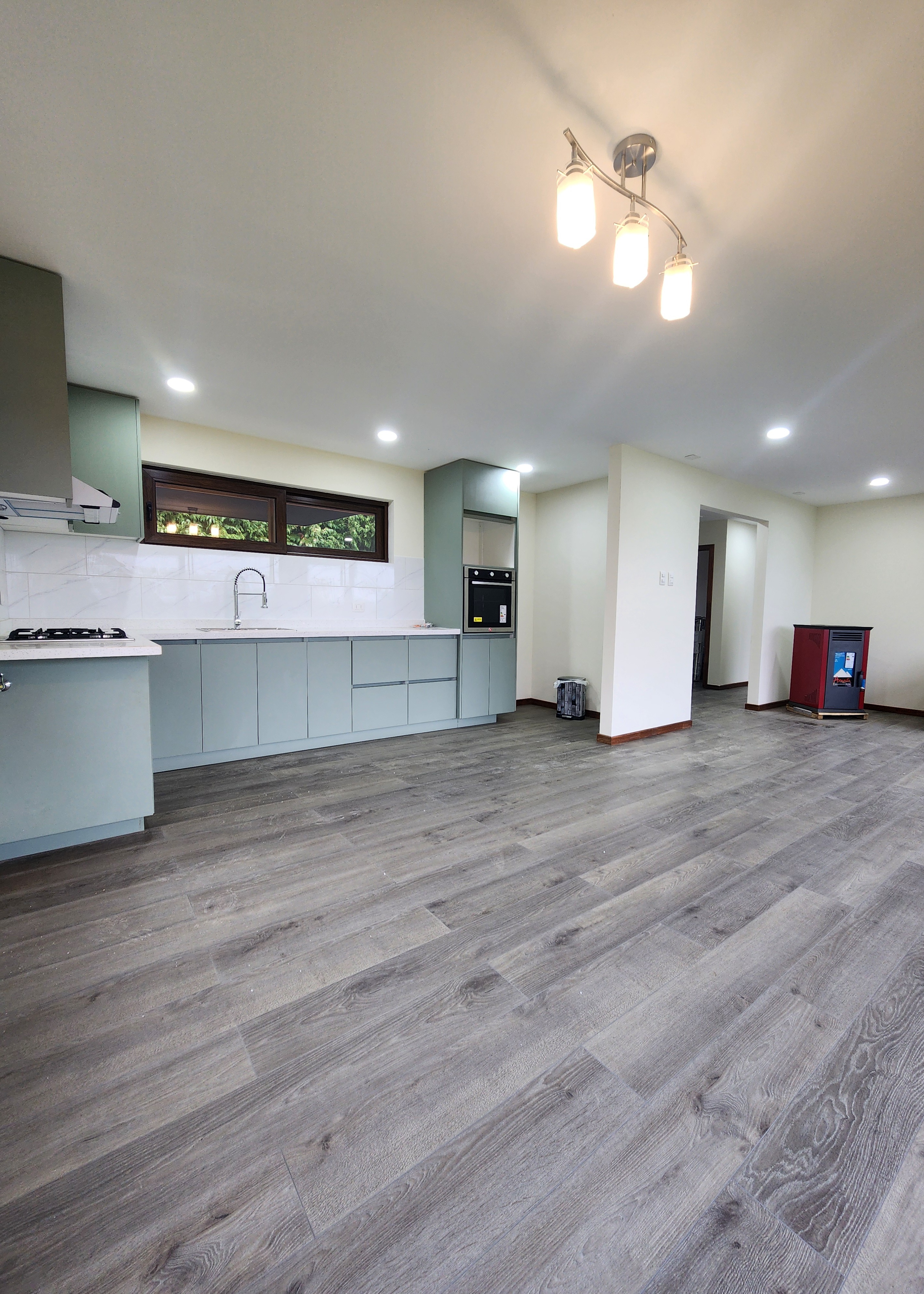 -Living comedor con cocina integrada y equipada con encimera ,campana, horno empotrado y     lámpara colgante.