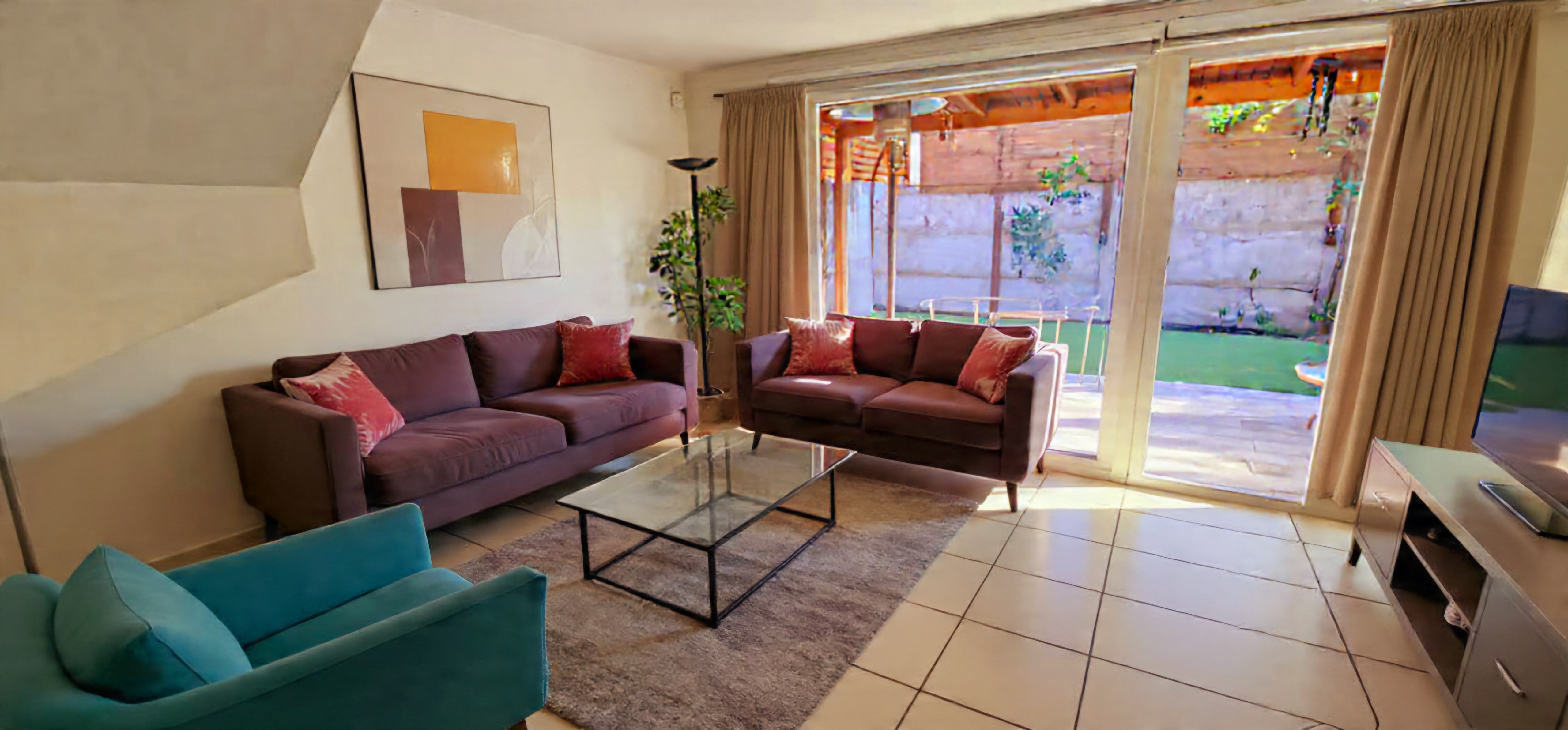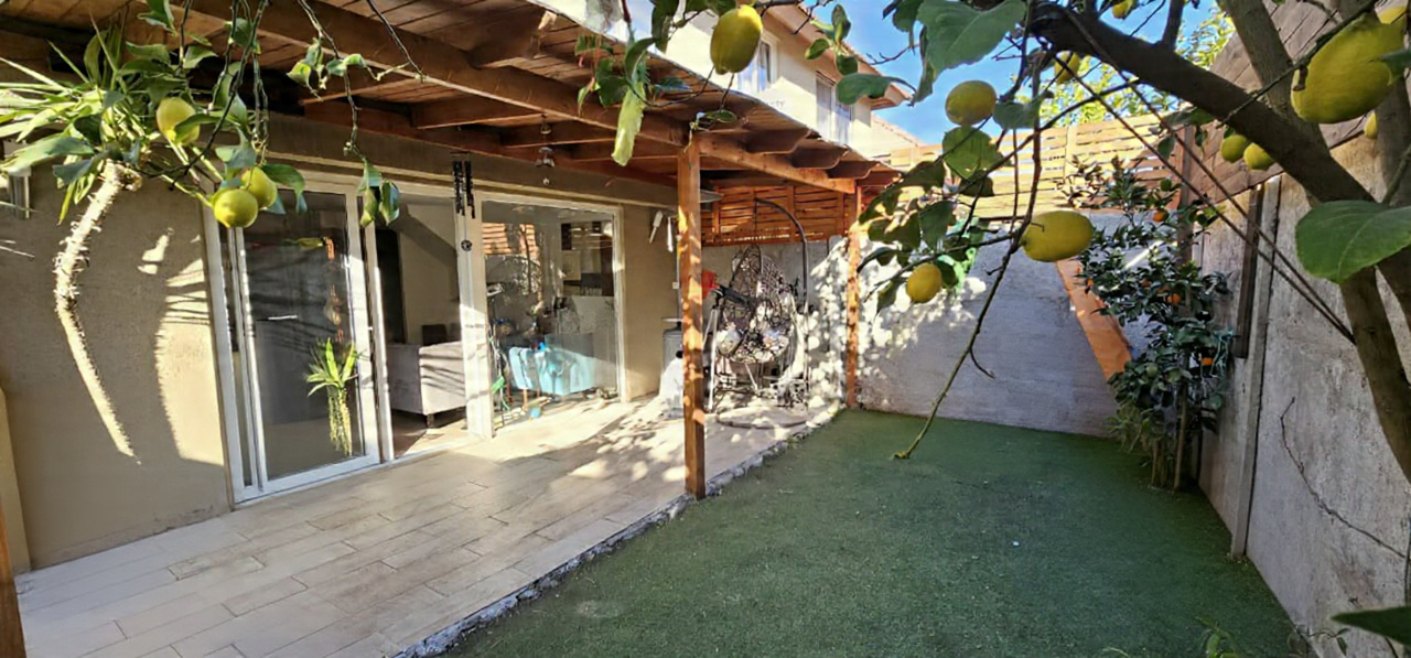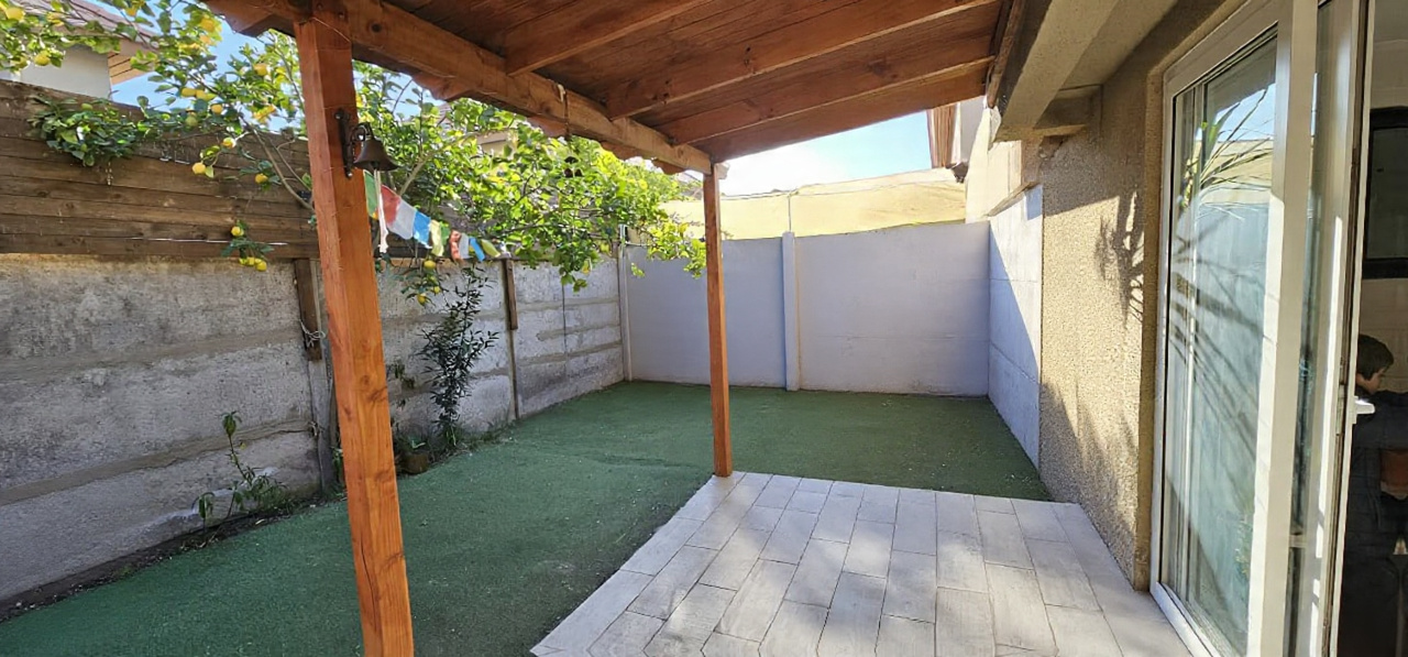 Al exterior, un patio con terraza y área verde Con Pasto Sintetico invita a disfrutar del aire libre: tardes de juego, celebraciones familiares o pausas de descanso bajo el sol.