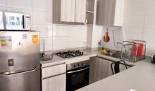 - Cocina completa y equipada con muebles, horno y encimera.