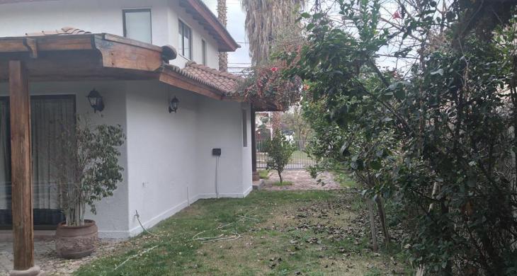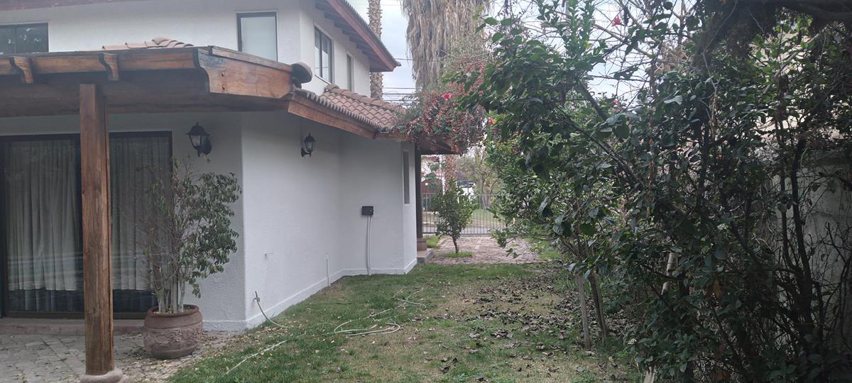 Patio amplio y agradable con terraza semi techada con piso de piedra pelequén, césped, arboles, plantas y arbustos como, níspero, naranjo, peumo, limón, matico entre otros.