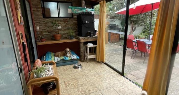 Terraza amplia y quincho , zona semi cerrada y al aire libre, barra de madera en el comedor, amplio con estufa a leña y tiro forzado. Living amplio y altos ventanales.