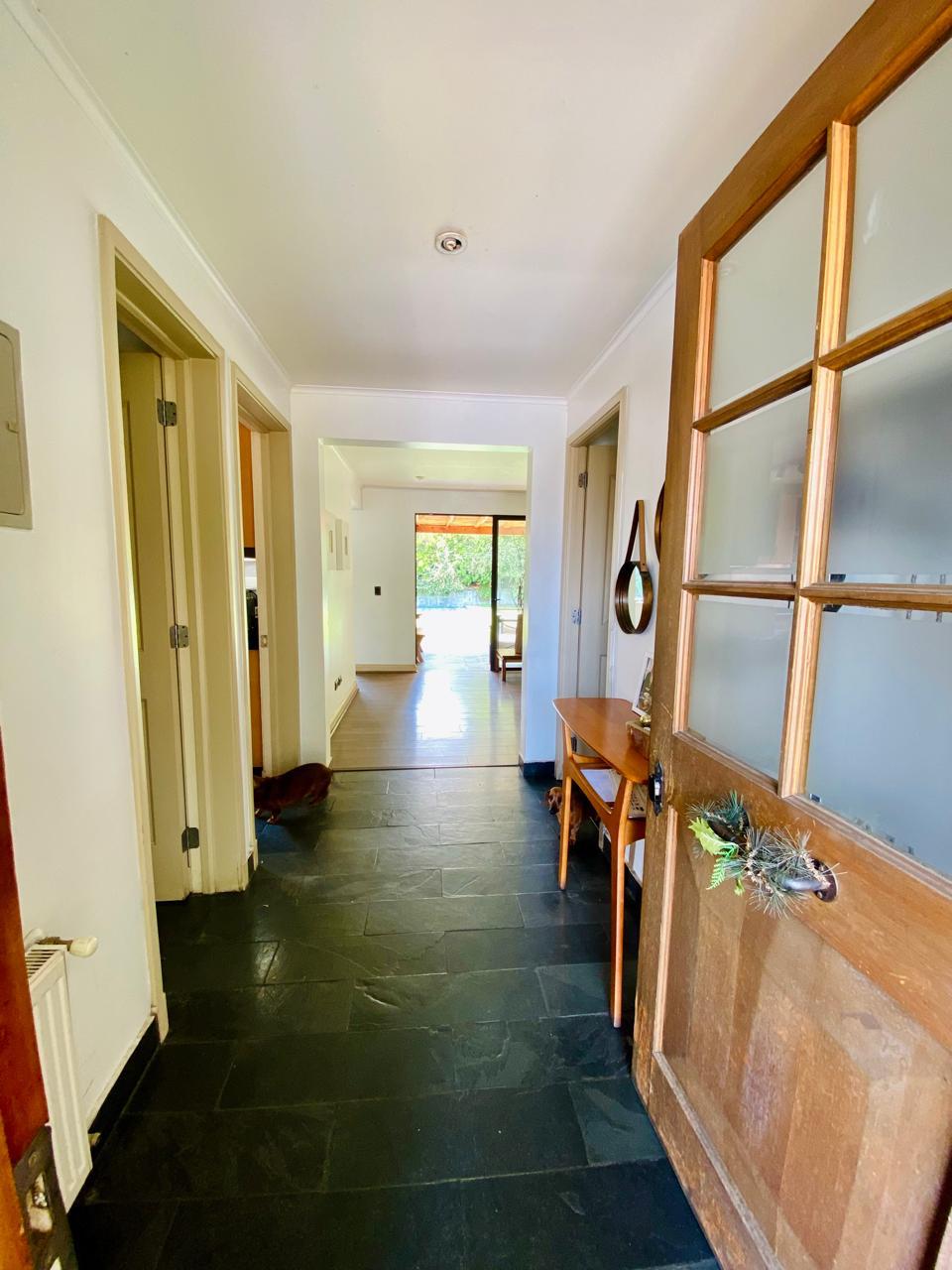 Hall de Acceso: Acogedor, con piso de piedra pizarra que se extiende hacia el living y comedor, otorgando calidez y carácter.