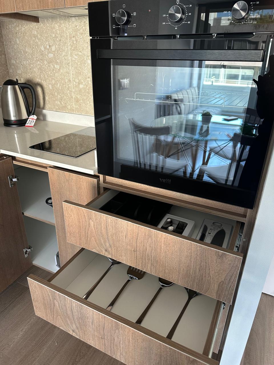 - Cocina americana con encimera de vitrocerámica, campana y horno, microondas, refrigerador.