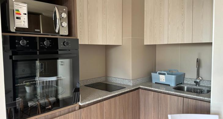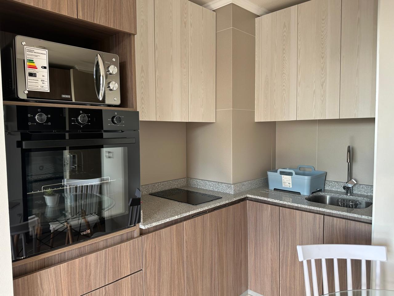 - Cocina americana con encimera de vitrocerámica, campana y horno, microondas, refrigerador.