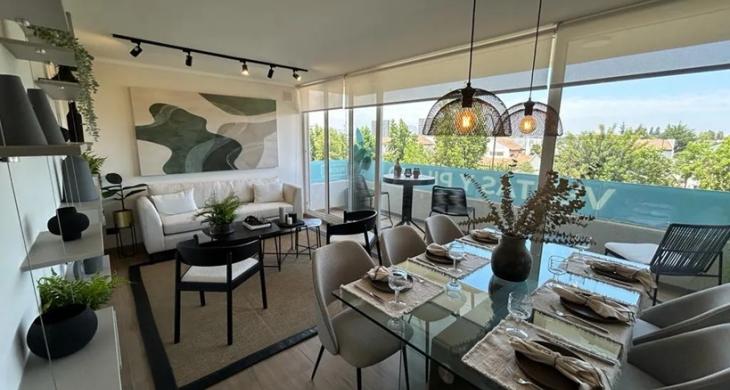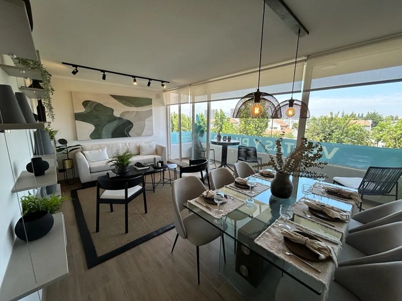 Características y terminaciones: piso gres porcelánico en todo el departamento. Barandas vidriadas en terrazas y ventanas termopanel con marco PVC. Shower door en baño principal.