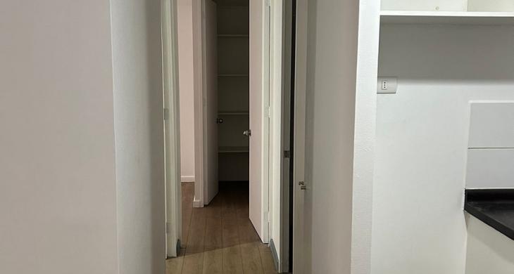 Dormitorio principal con walking closet, dormitorio mediano para cama de una plaza ½ más velador y closet, un baño completo y termo eléctrico para agua caliente, lo que favorece en el pago de gastos comunes.
