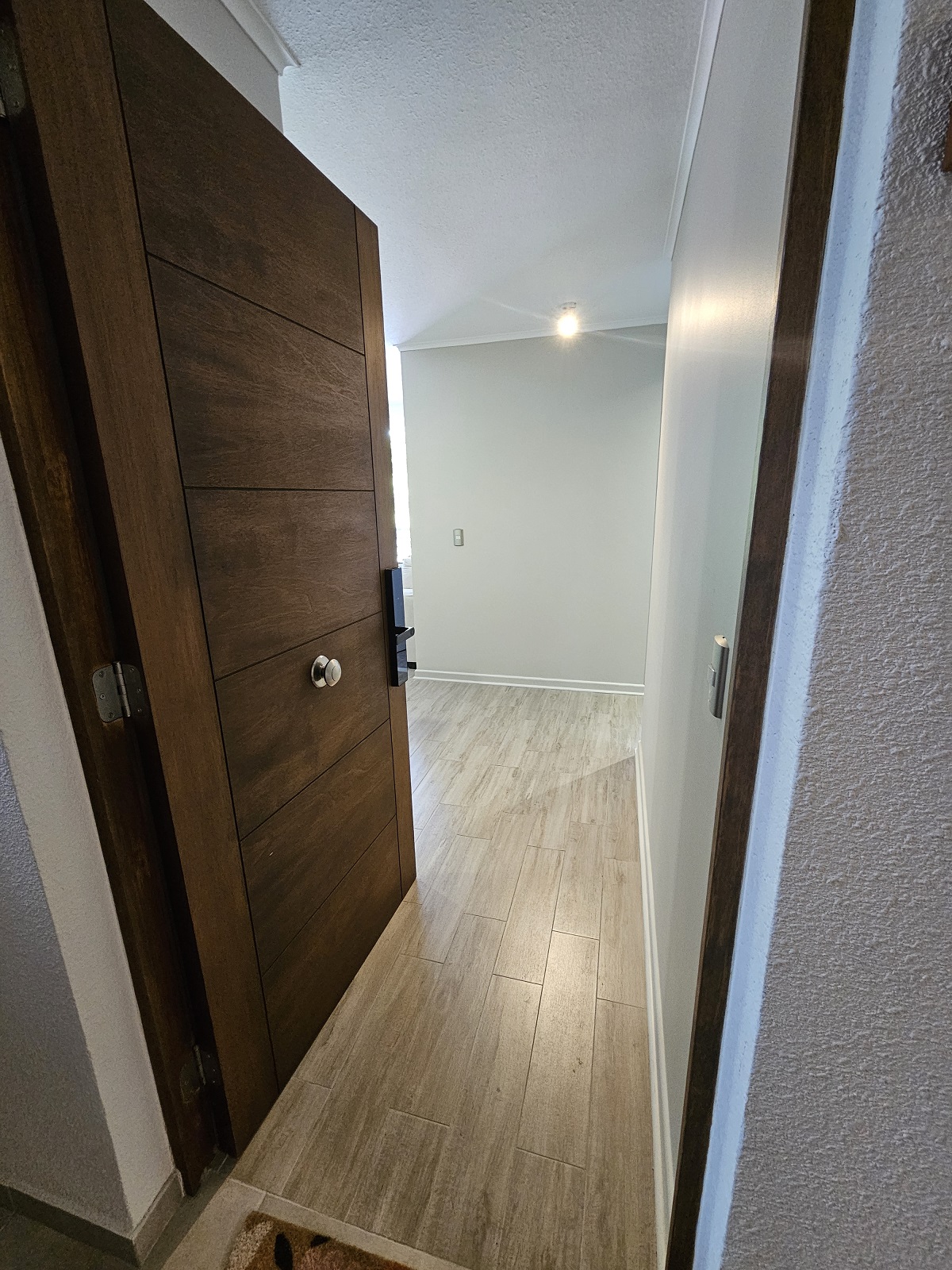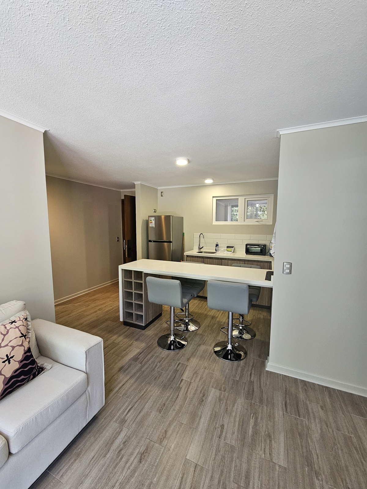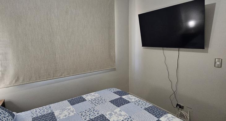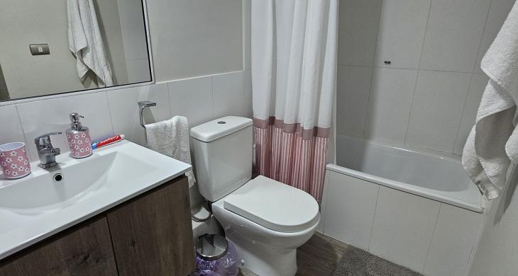 Ubicado en el prestigioso Condominio Robles del Volcán, este departamento de 57 metros cuadrados totales destaca por su diseño funcional y excelente estado de conservación, habiendo sido construido en el año 2020. La unidad se encuentra estratégicamente posicionada en el segundo piso, ofreciendo una distribución inteligente que maximiza cada espacio habitable. Cuenta con dos amplios dormitorios, incluyendo una habitación principal en suite diseñada para el máximo descanso, y dos baños completos con terminaciones contemporáneas. El área social integra la cocina con el living-comedor, extendiéndose hacia una acogedora terraza privada de 3 metros cuadrados, perfecta para contemplar el paisaje local.