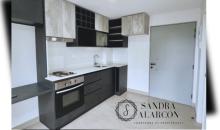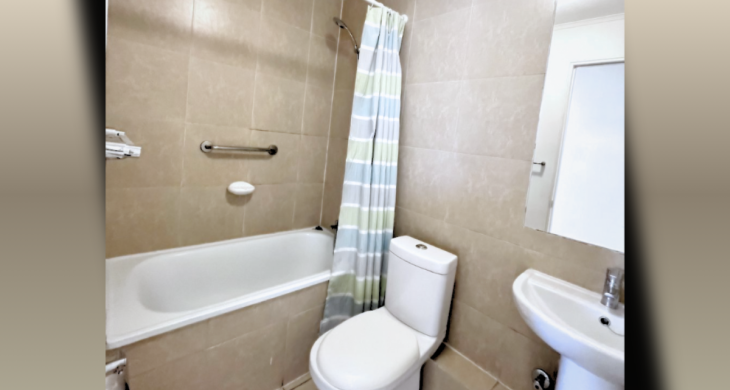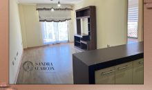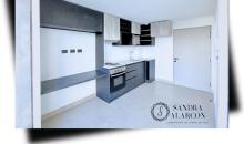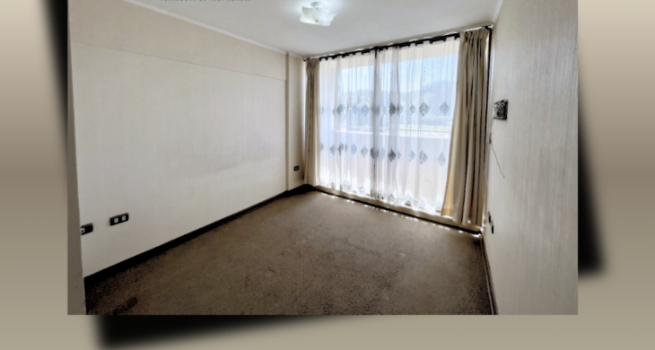 Living comedor con salida a balcón, cocina cerrada amoblada y equipada, 3 dormitorios, uno con baño en suite y un baño, estacionamiento y bodega. Incluye lámparas y cortinas.