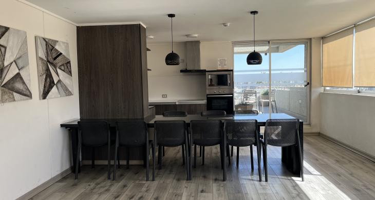 En cuanto a las características adicionales, el inmueble incluye un estacionamiento privado, un elemento esencial para la comodidad urbana actual. La seguridad es una prioridad en este complejo, contando con vigilancia y conserjería las 24 horas del día, además de accesos controlados que garantizan un ambiente seguro y tranquilo para todos los residentes. El living comedor se integra armoniosamente con una cocina de concepto moderno, creando un espacio fluido y luminoso gracias a su excelente posición dentro del edificio, lo que asegura una vista despejada y gran entrada de luz natural durante el día.
