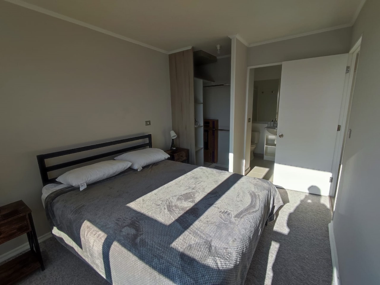 - Cama 2 plazas con respaldo, 2 veladores, 2 lámparas y almohadas.