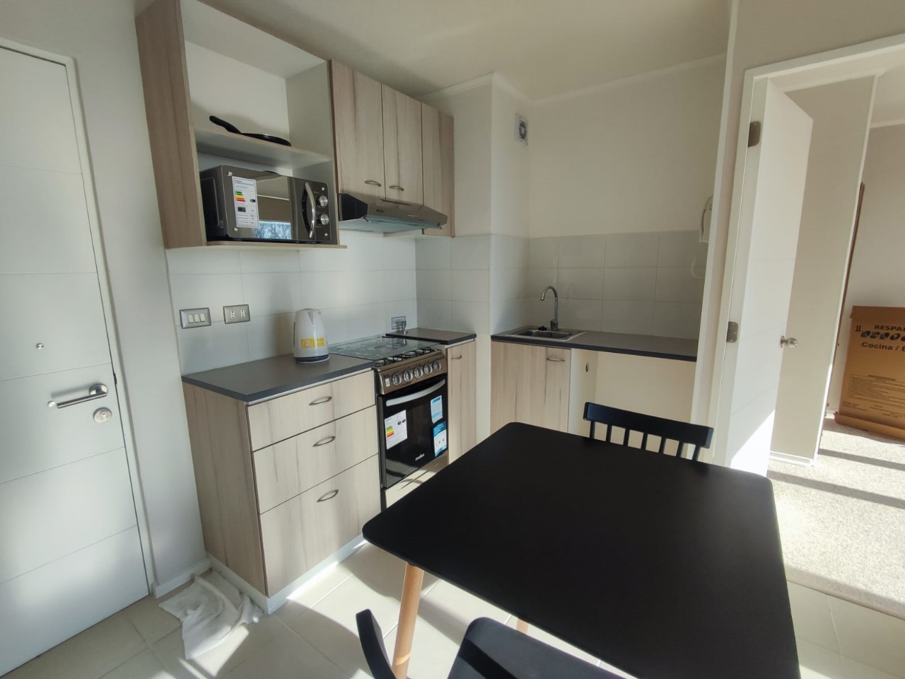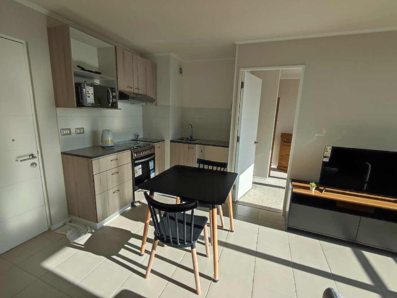 - Cocina a gas, Microondas, Refrigerador, Campana, Hervidor,2 Taburetes, Batería de cocina, Loza y Cubiertos.