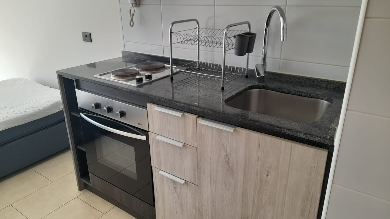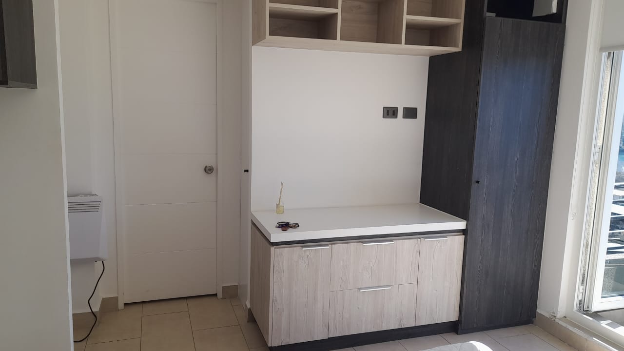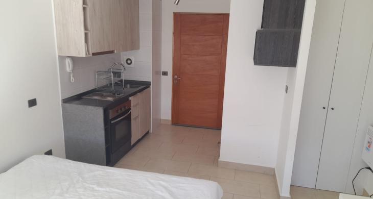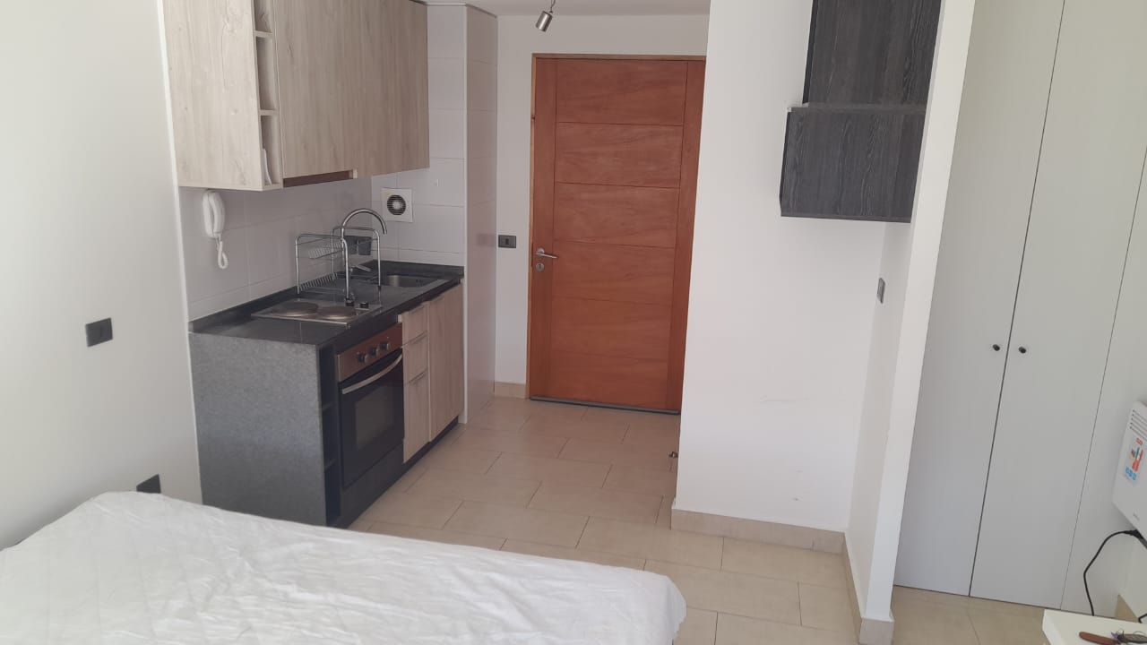 Departamento Studio, equipado con encimera, horno eléctrico, termo eléctrico, refrigerador, cama, lámparas, roller.