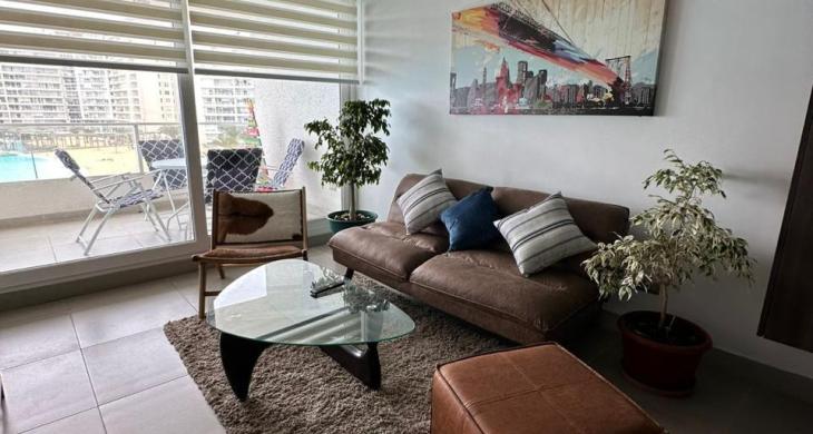 La propiedad se distribuye en una superficie de 56 metros cuadrados construidos, diseñados meticulosamente para maximizar la entrada de luz natural y la funcionalidad de cada ambiente. Ubicado estratégicamente en el cuarto piso de una moderna torre de 11 niveles, el inmueble cuenta con una distribución óptima de dos dormitorios, destacando la habitación principal en suite que garantiza total privacidad y descanso. El programa arquitectónico se complementa con dos baños completos con terminaciones contemporáneas, una cocina integrada totalmente amoblada y equipada con electrodomésticos de calidad, y un acogedor living que invita al relajo diario.