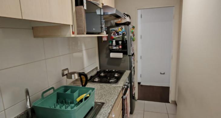 Cocina independiente amoblada con encimera, cubierta de granito, horno a gas, logia con calefont.