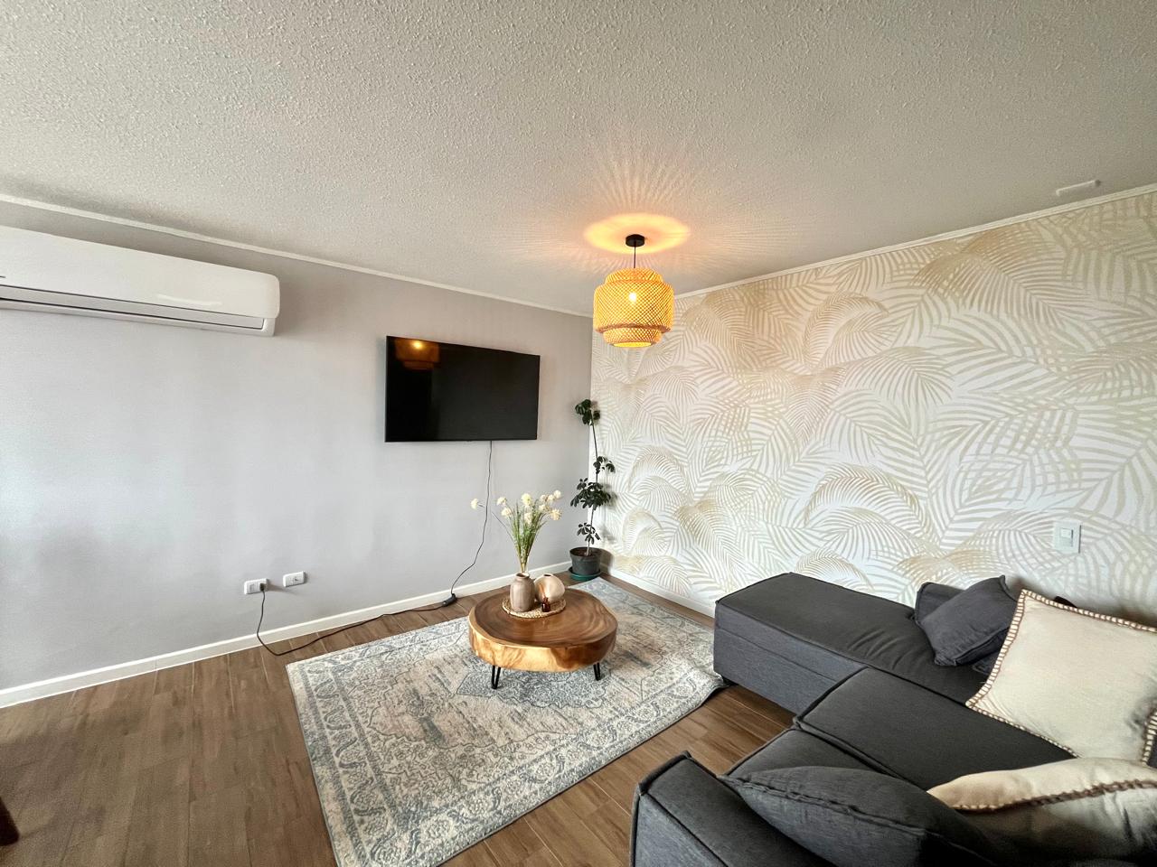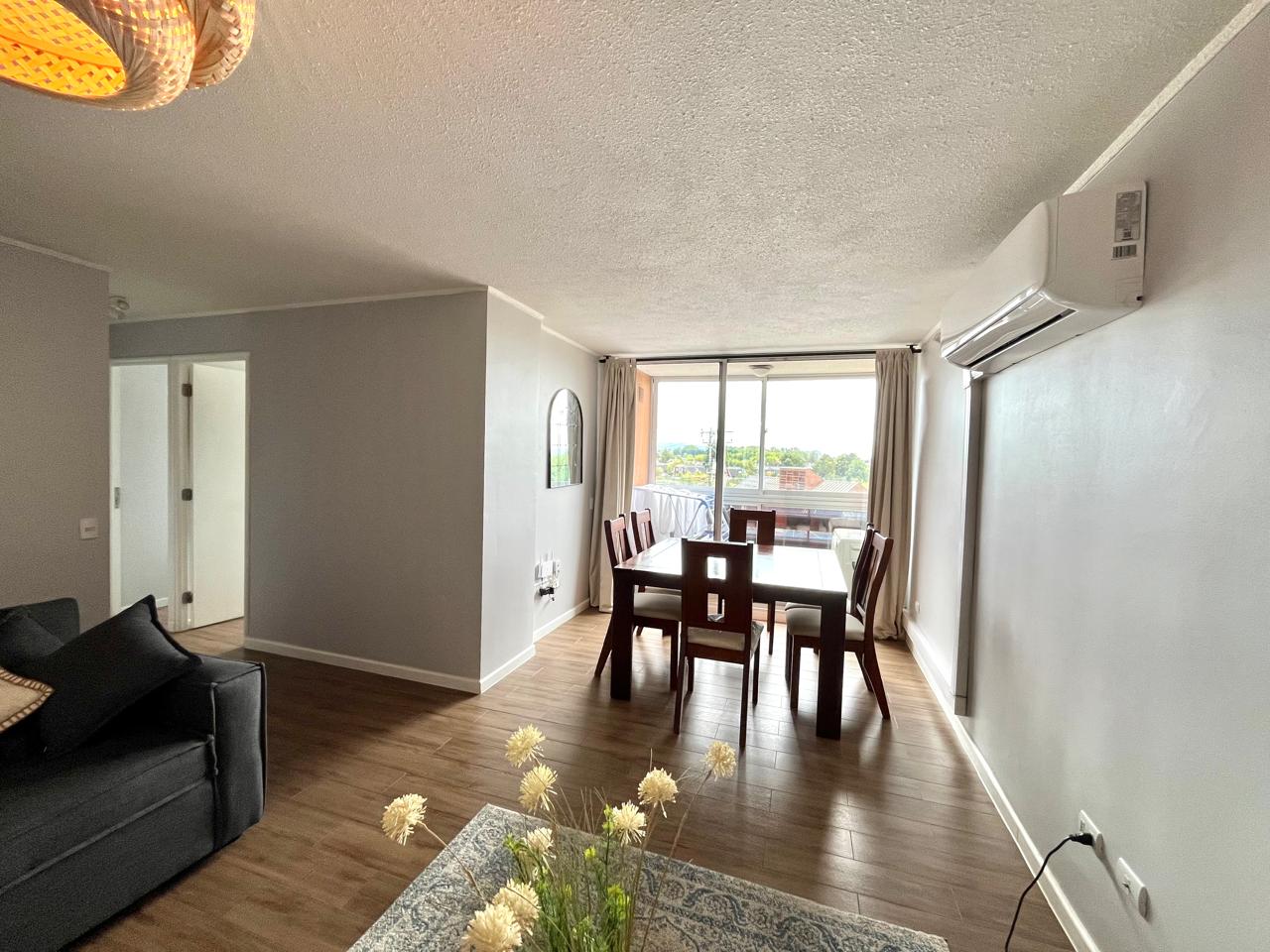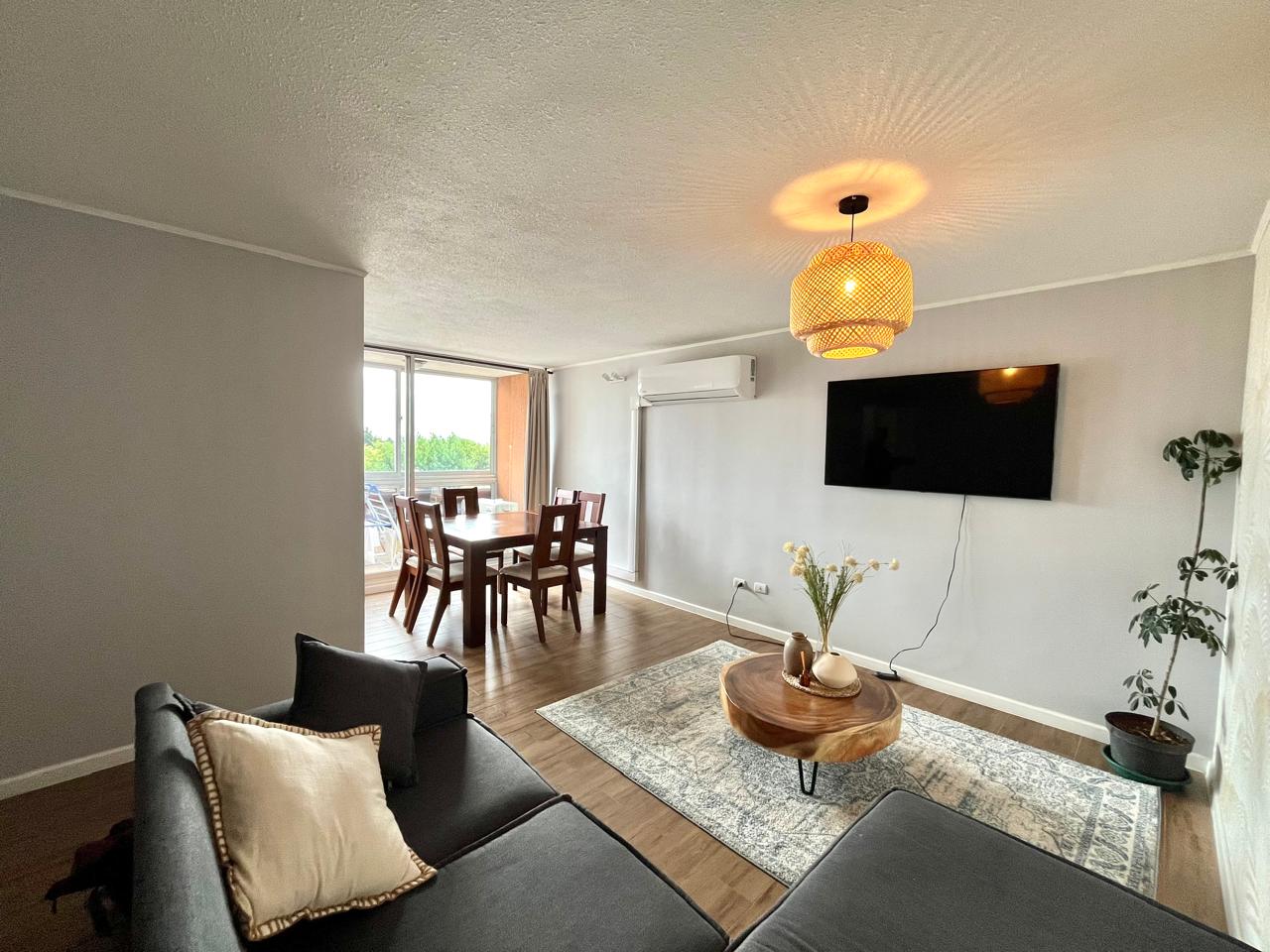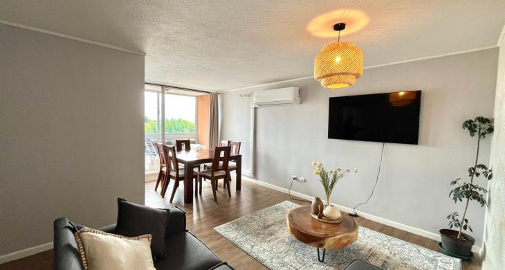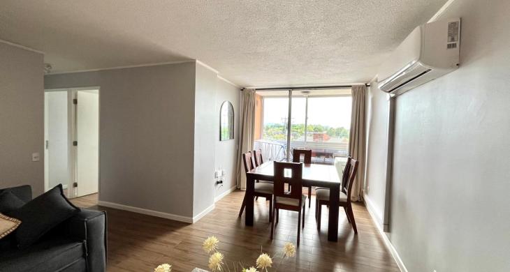 ISA corretajes arrienda lindo departamento AMOBLADO en Condominio Lomas del Río I. Cuenta con espacioso living - comedor con aire acondicionado y salida a terraza. Cocina amoblada y equipada con logia y lavadora. Tres dormitorios, principal en suite y 2 baños. El departamento incluye muebles y menaje para una estadía cómoda y relajada. Cercano a locomoción, supermercados, colegios y hospital base.