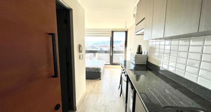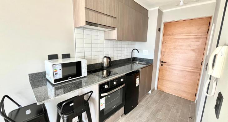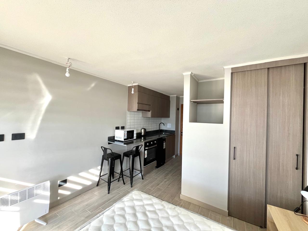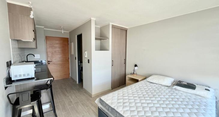 Departamento Estudio AMOBLADO en Edificio R, sector Costanera. Superficie de 18,77 mts2 con terrraza de 4,5 mts. Consta de Cocina incorporada con muebles, refrigerador, cocina y horno eléctricos, departamento de 1 ambiente con cama de 2 plazas, clóset, baño y terraza. Electrodomésticos y vajilla. Pisos de porcelanato y ventanas de termopanel. Full eléctrico. El edificio cuenta con acceso controlado y portería 24 hrs, ascensor, lavandería, quincho. Estacionamiento para bicicletas. A pasos de costanera Arturo Prat y avenida principal Ramón Picarte. No se admiten mascotas. Departamento con bodega, SIN estacionamiento.