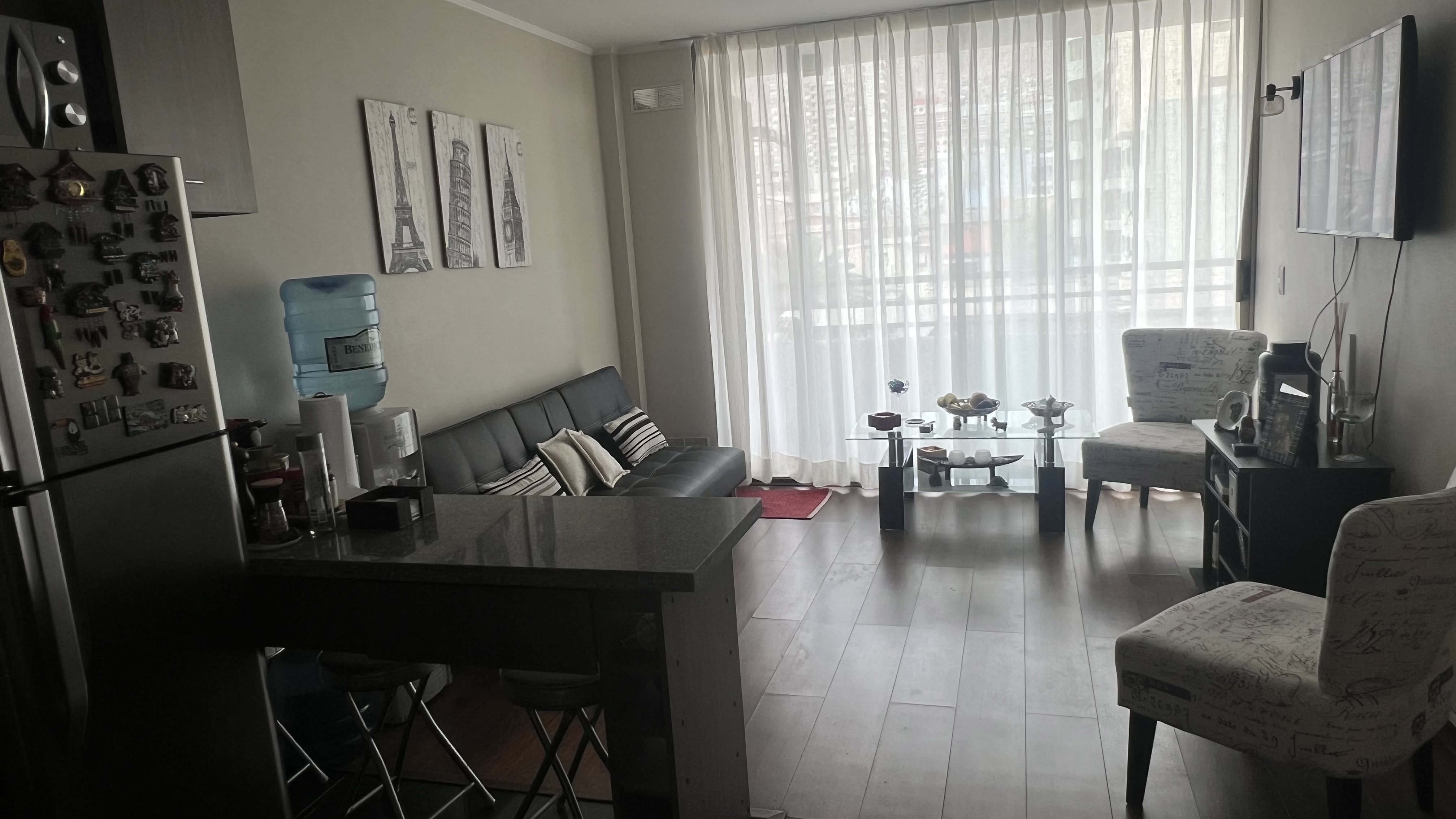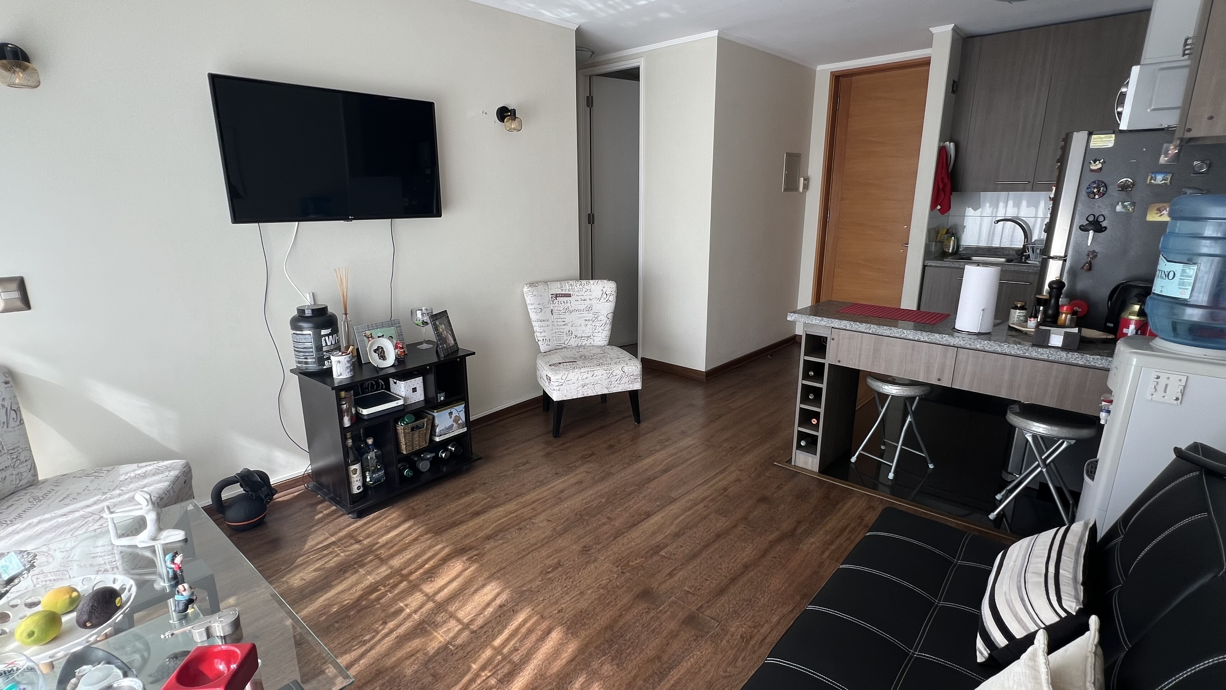 - Living con sofá cama, televisor, mesa de centro.