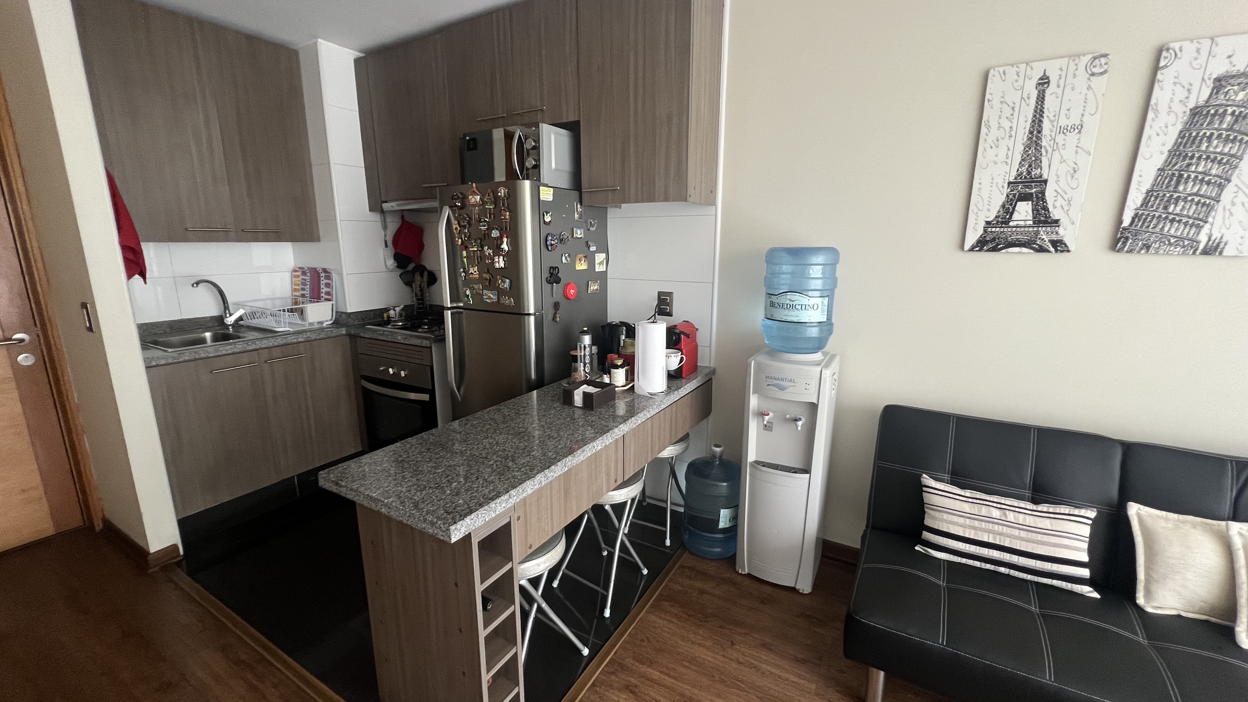 - Cocina completamente equipada con refrigerador, microondas, encimera, vajillas, servicios.