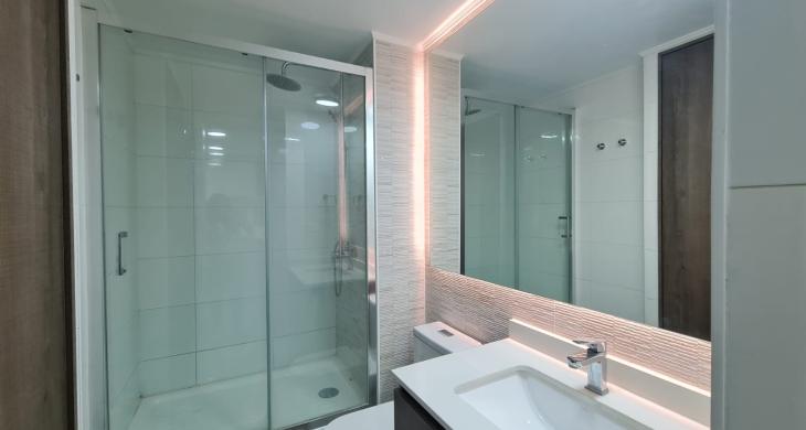 1 baño con piso de porcelanato, cubierta de mármol y resina.