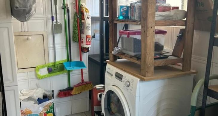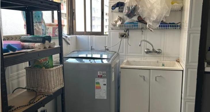 cocina equipada con cocina encimera a gas, horno eléctrico, amplia logia con espacio para lavadora y secadora.