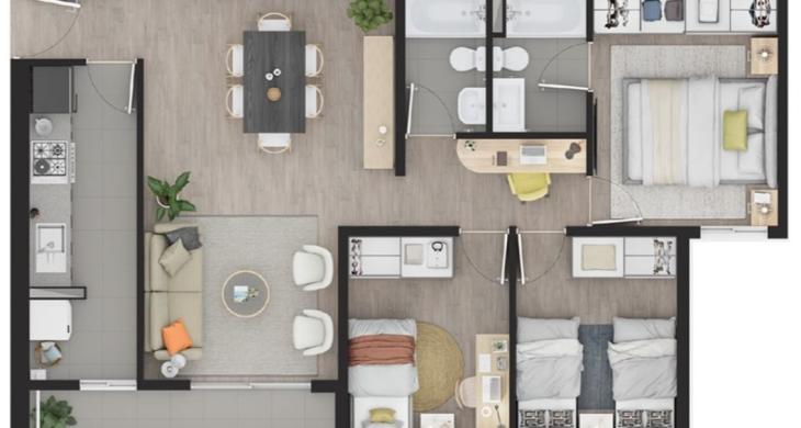 Este impecable departamento, con entrega proyectada para 2025, ofrece 74 m² distribuidos inteligentemente en 3 dormitorios, incluyendo un dormitorio en suite, y 2 baños completos. Cuenta con un estacionamiento exclusivo, garantizando tu comodidad y seguridad vehicular. Ubicado en el sexto piso, goza de una excelente iluminación natural y ventilación.
