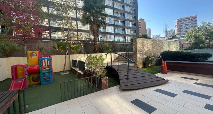 Departamento con amplio dormitorio, cocina americana, conexión a lavadora y espacios bien utilizados. Edificio cuenta con áreas verdes, Piscina, Quinchos, salones comunes entre otras áreas.