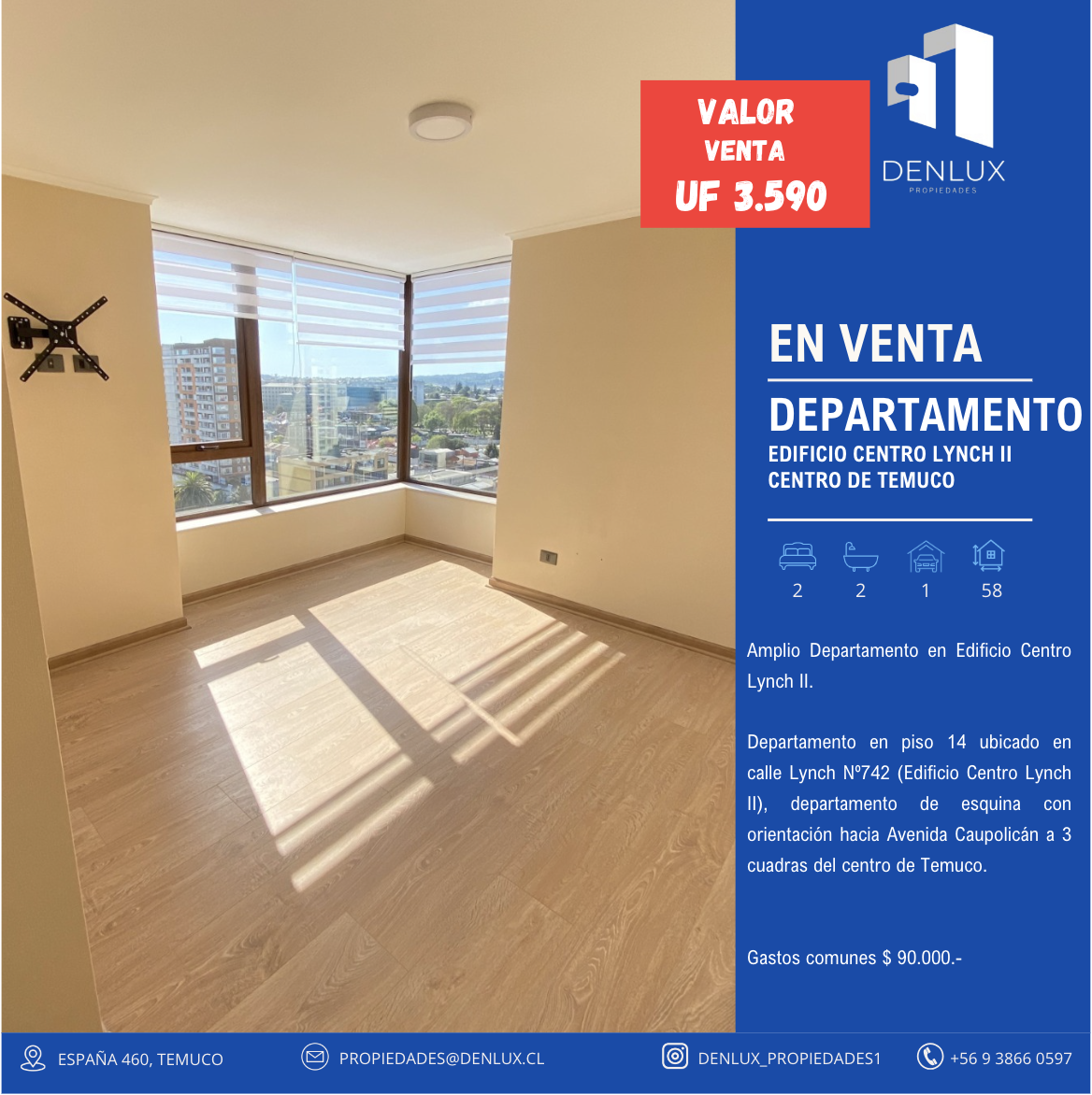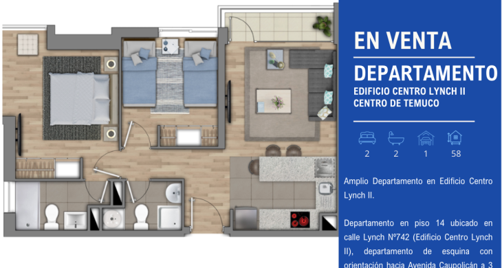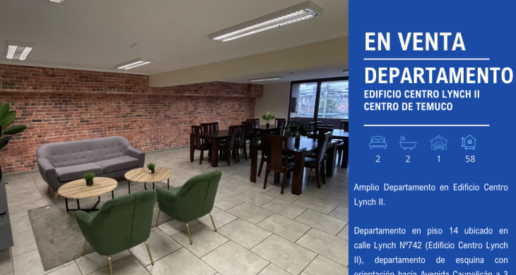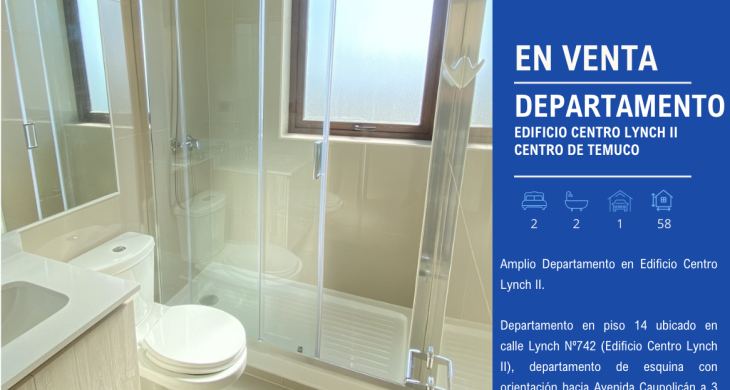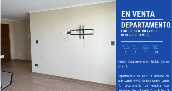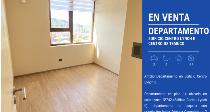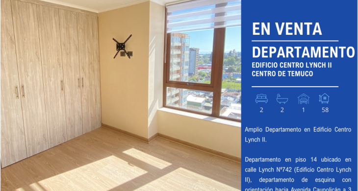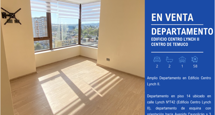 Departamento en piso 14 ubicado en calle Lynch Nº742 (Edificio Centro Lynch II), departamento de esquina con orientación hacia Avenida Caupolicán a 3 cuadras del centro de Temuco.
