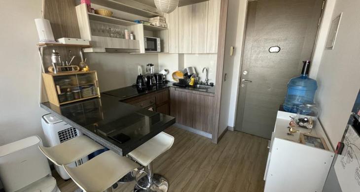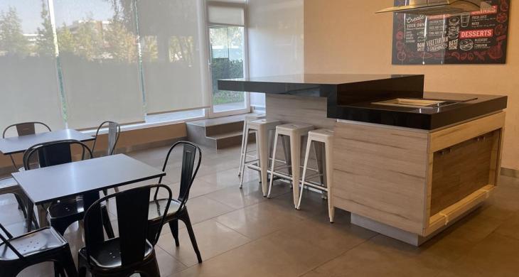 Cocina concepto abierto con muy buen mesón de granito, cocina amoblada y equipada con encimera, horno y campana.