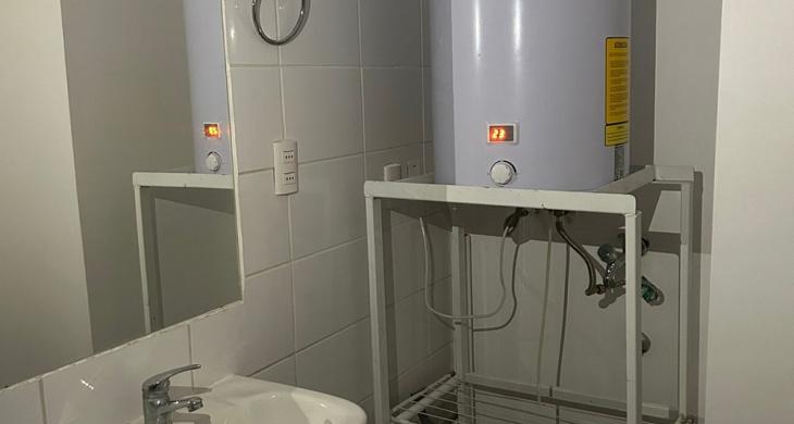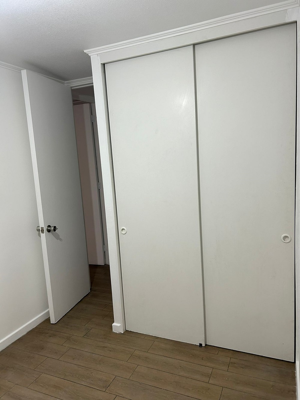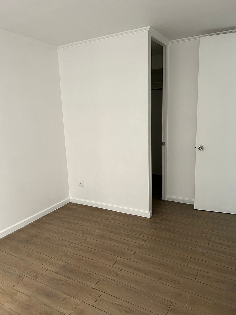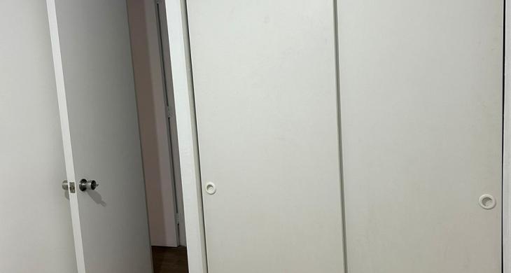 Dormitorio principal con walking closet, dormitorio mediano para cama de una plaza ½ más velador y closet, un baño completo y termo eléctrico para agua caliente, lo que favorece en el pago de gastos comunes.