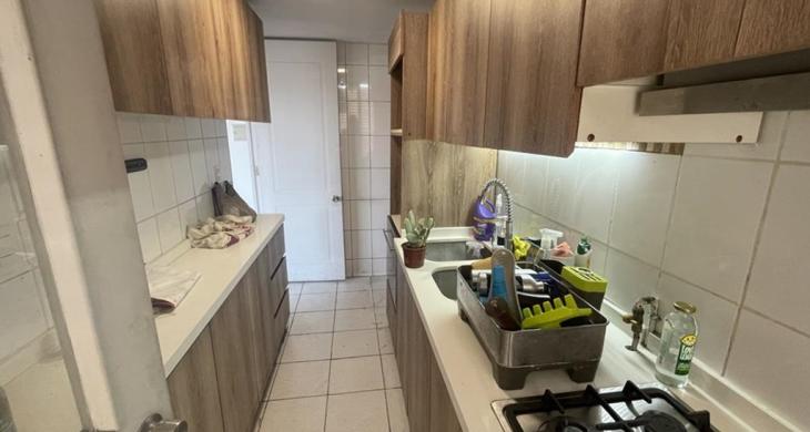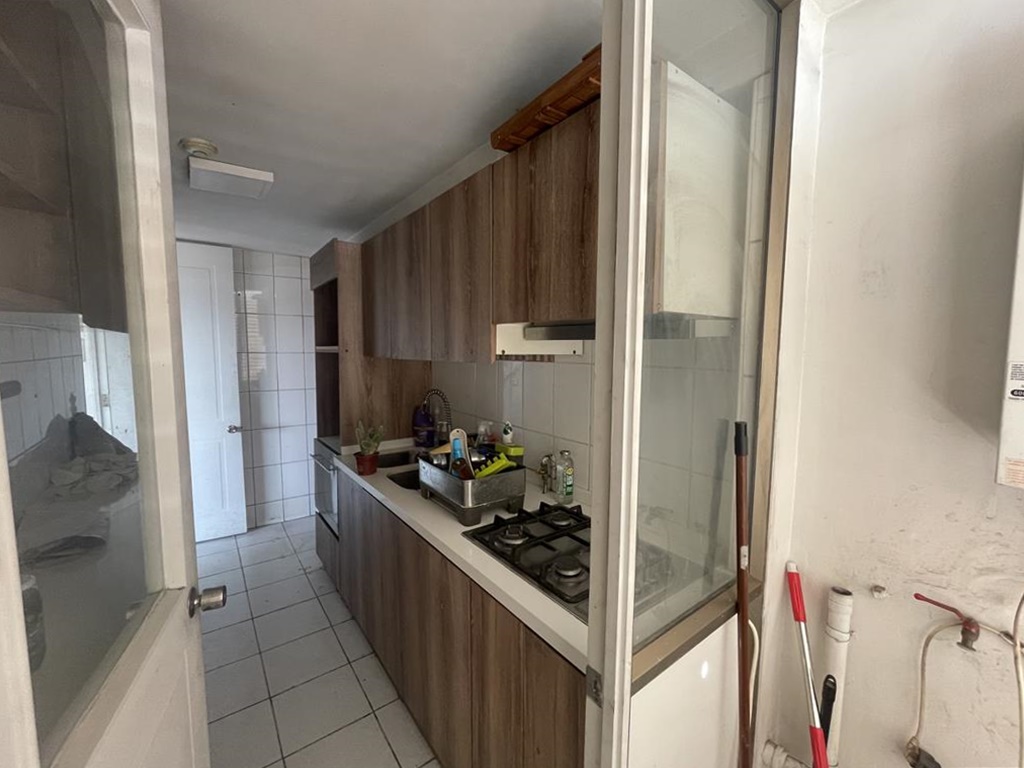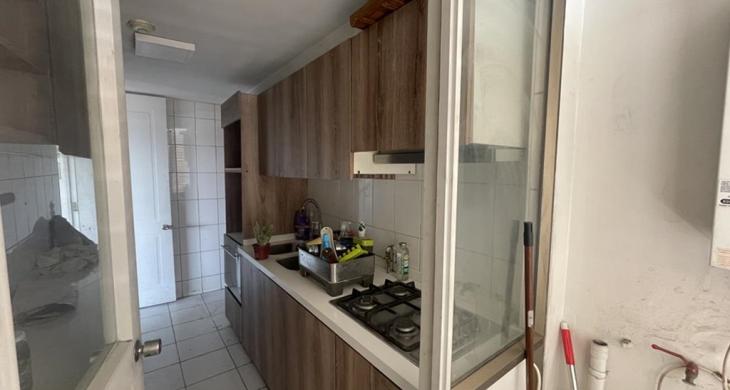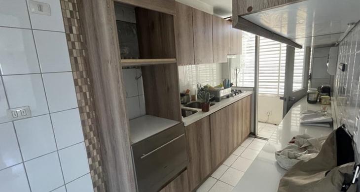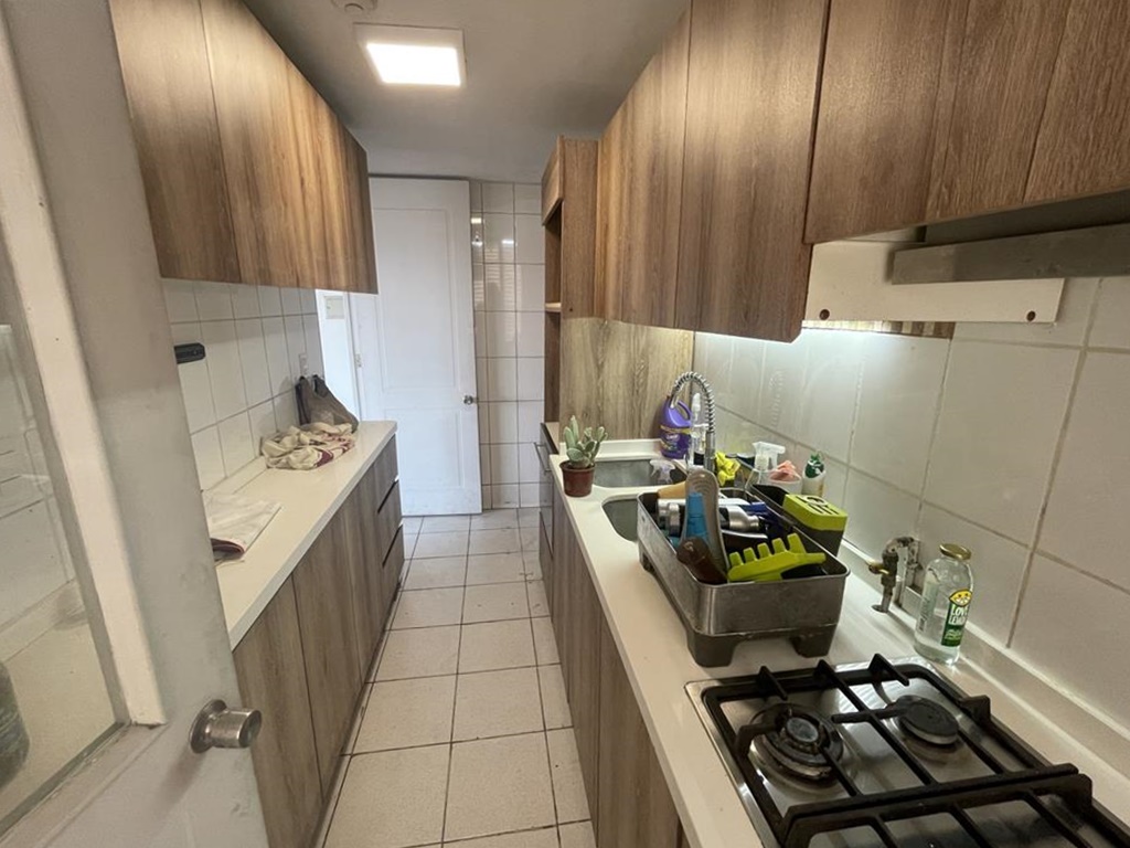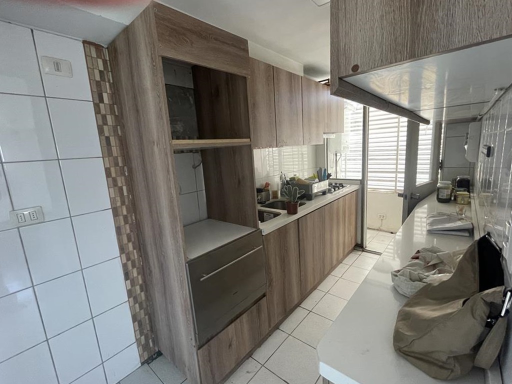 Cuenta con cocina tradicional, equipada con encimera cuatro platos, campana, horno, lavavajillas, mesón de granito para el tentempié, en el fondo y separada con puerta está la logia, buena ventilación.