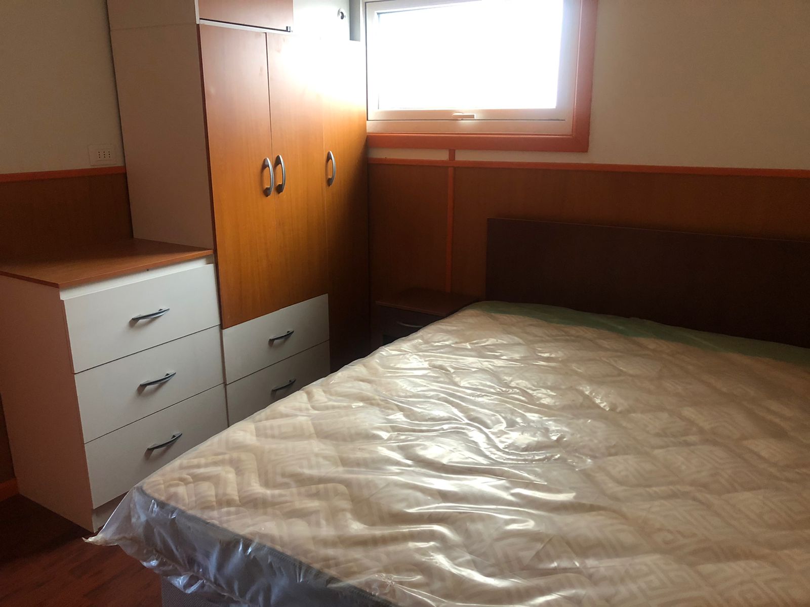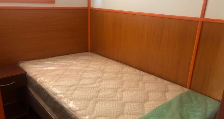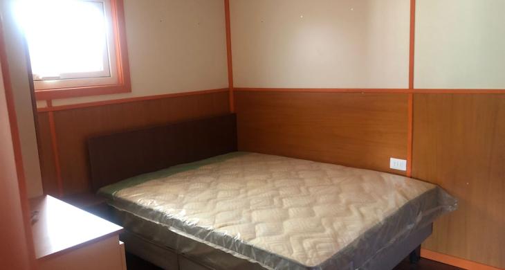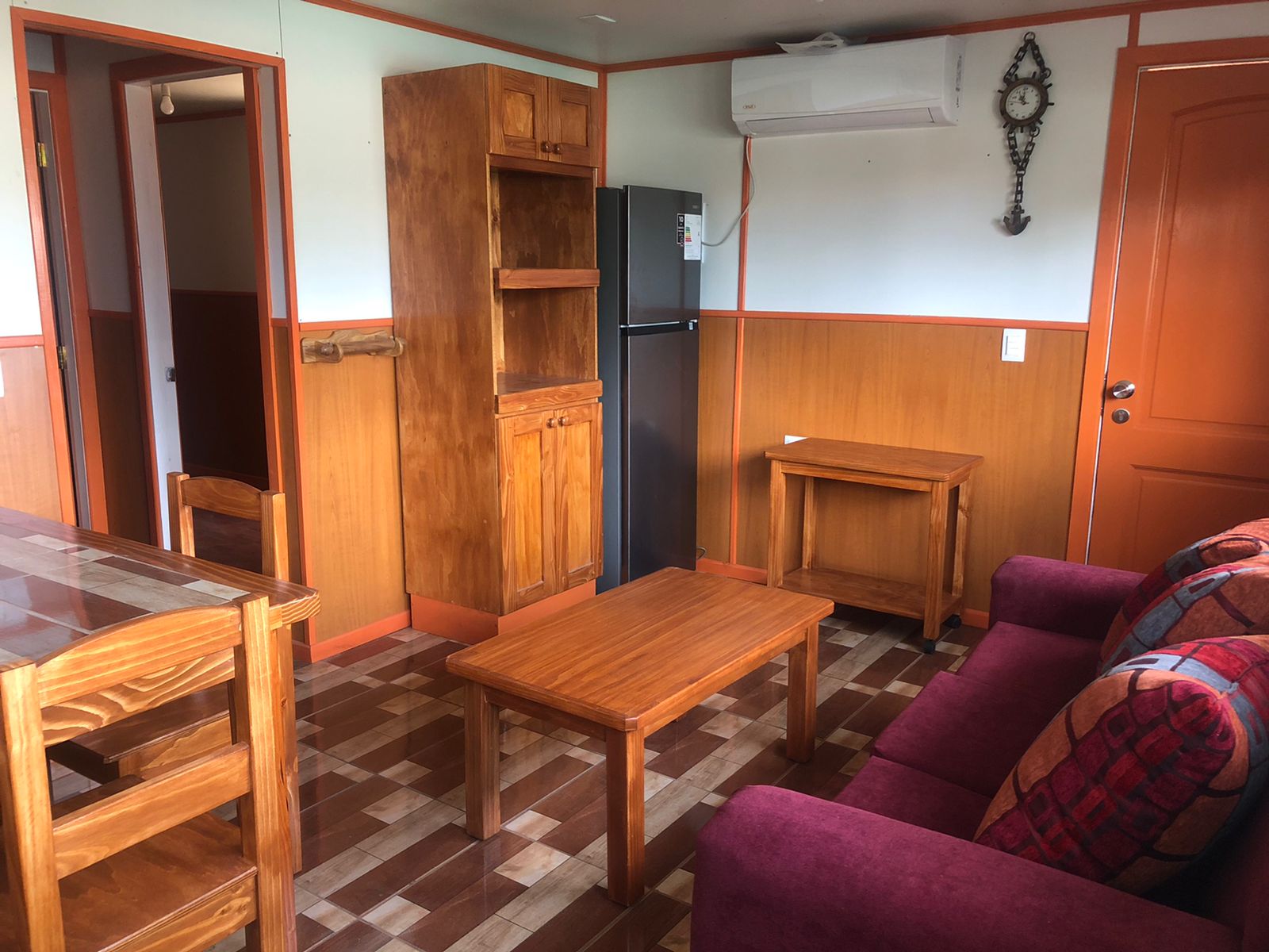 Entrada con portón y reja, living comedor, cocina americana amoblada (con loza y ollas), cocina a gas con horno, extractor, refrigerador, baño completo con ducha, 2 dormitorios con closet, cama y velador (el segundo dormitorio es más pequeño).