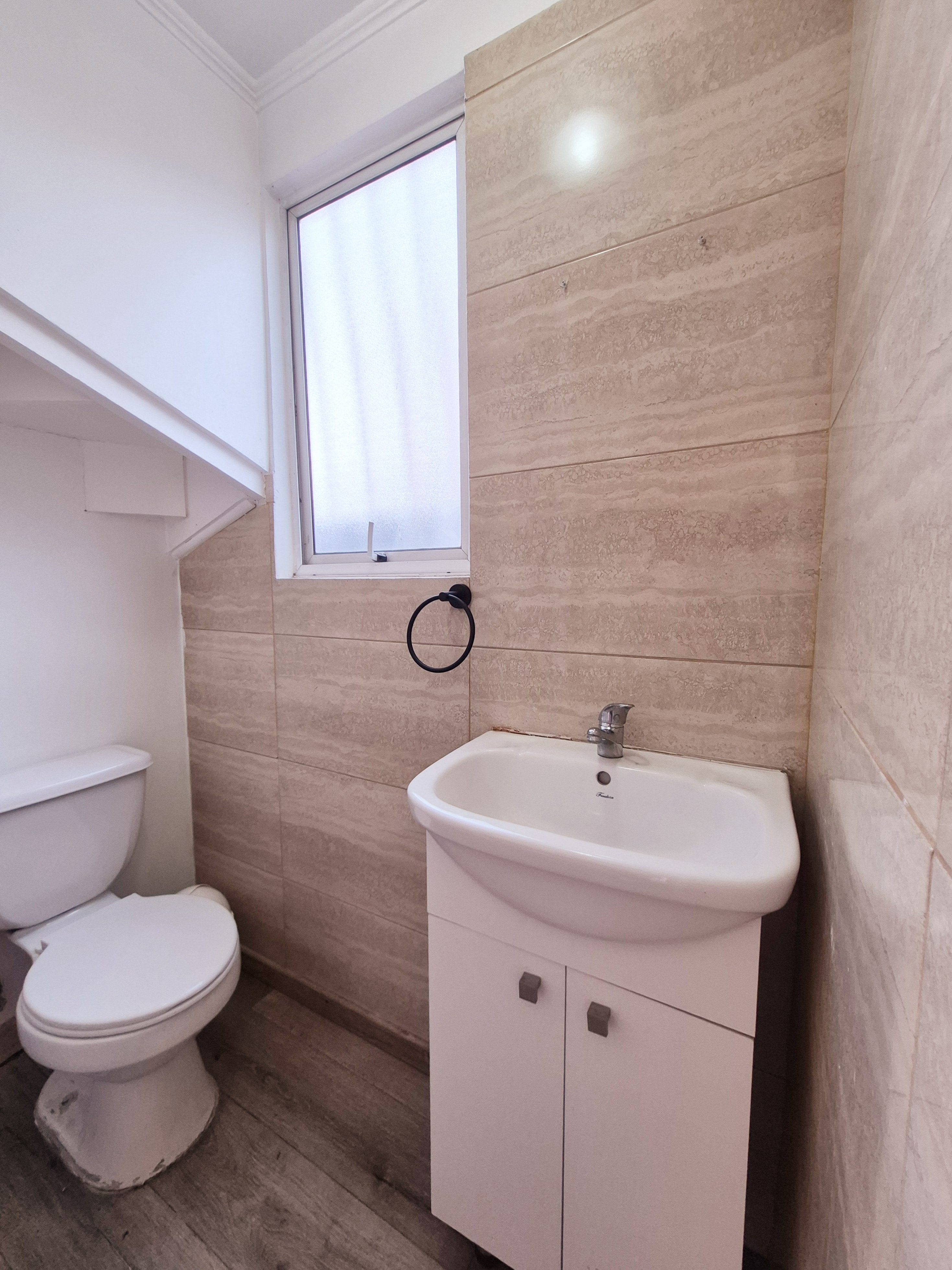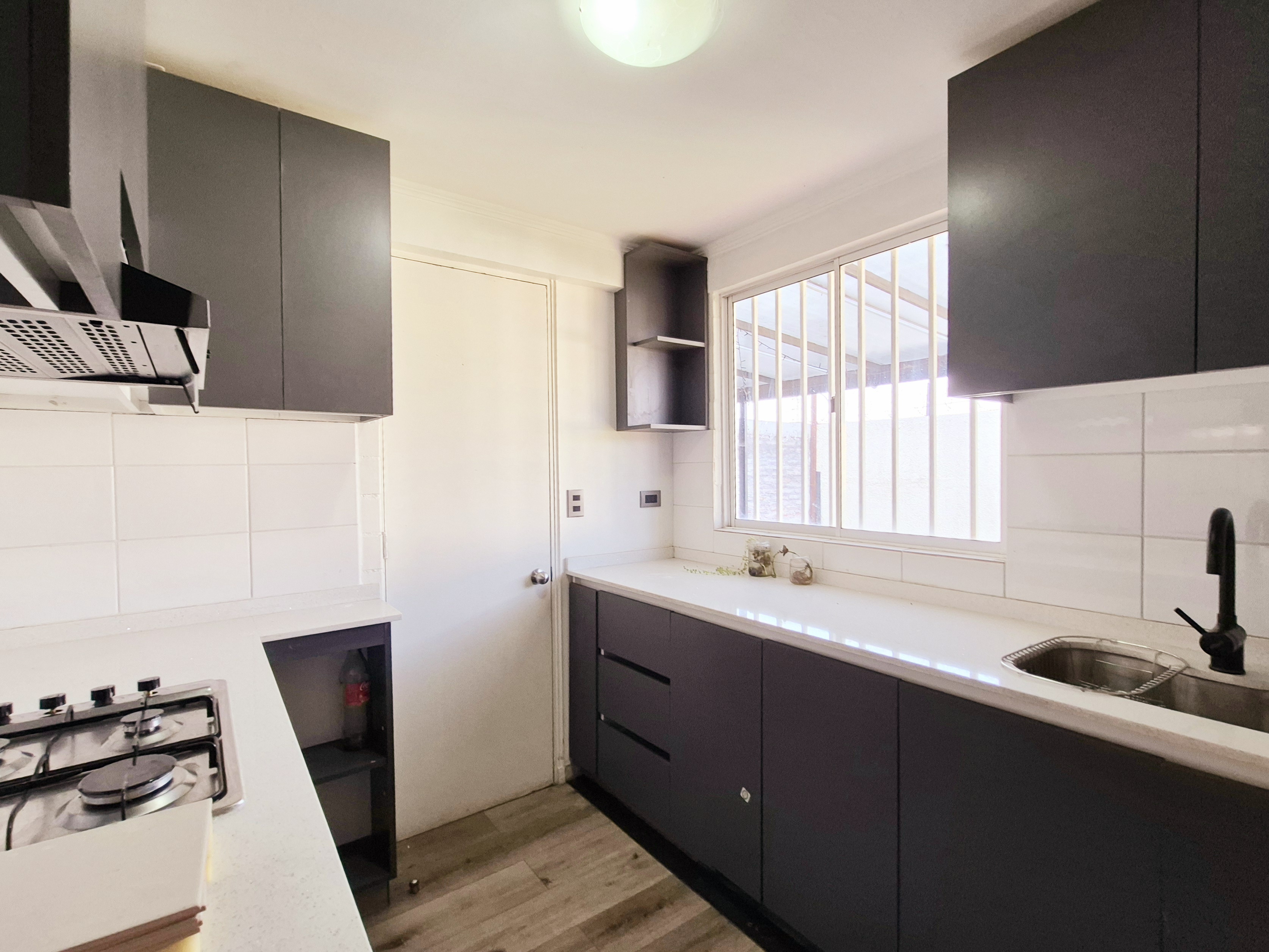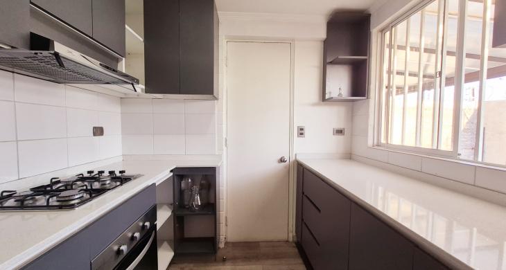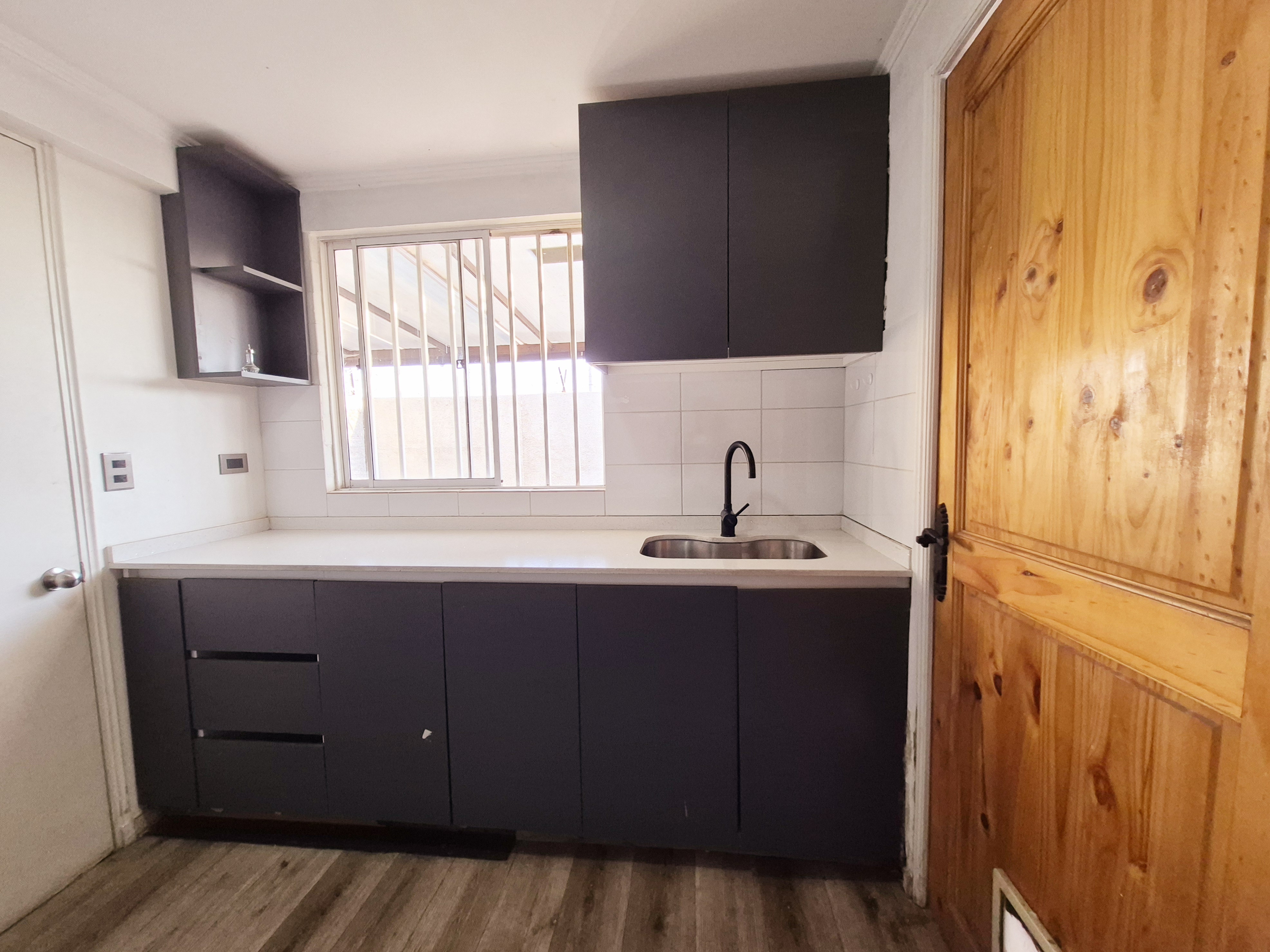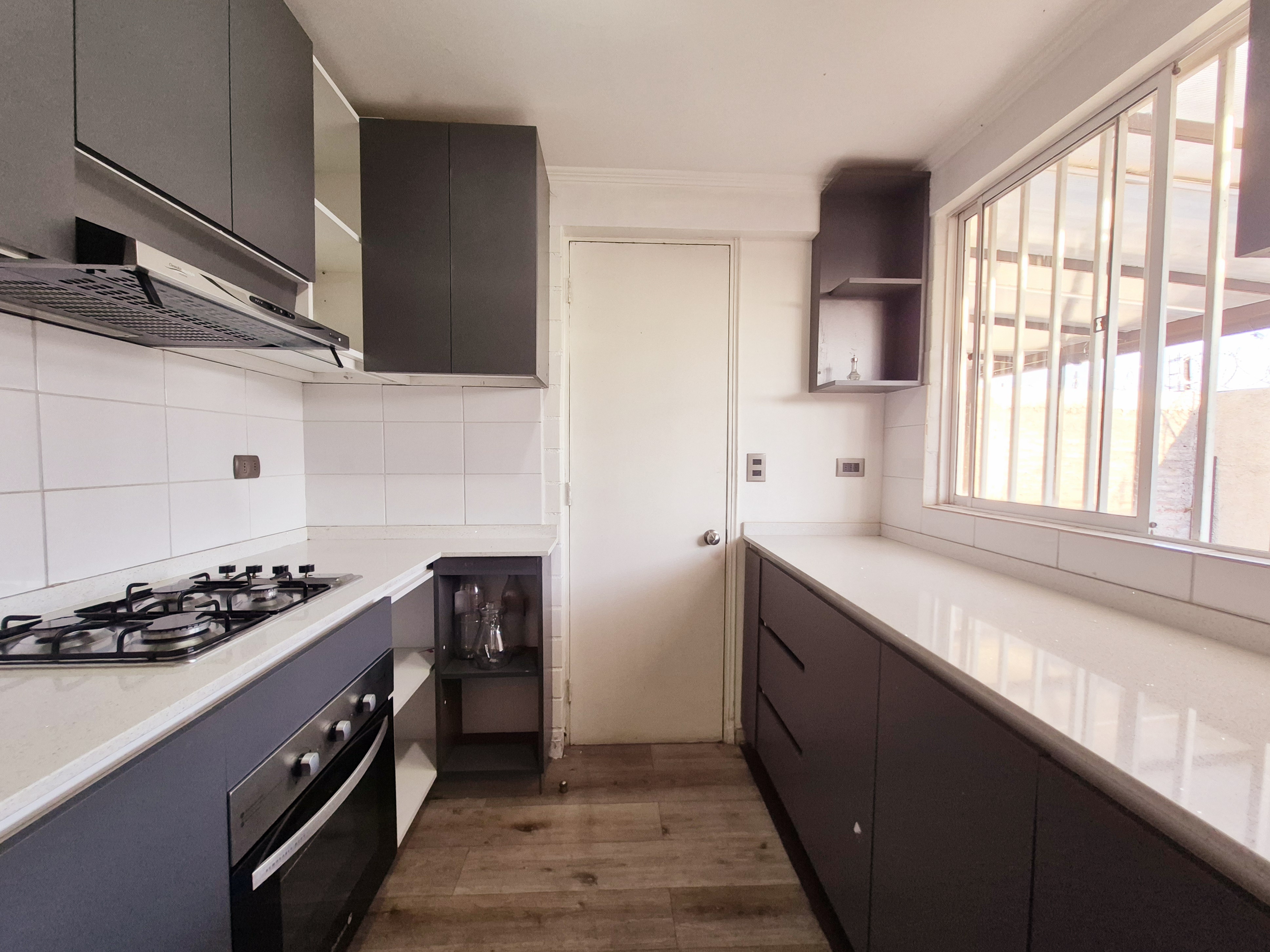 cocina Concepto cerrado con muebles Nuevos ,Empotrados .Equipada con horno,Campana y encimera .Puerta con salida A estacionamiento .