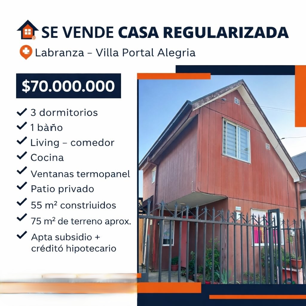 Descubre la oportunidad de adquirir tu hogar ideal en un barrio tranquilo y consolidado de Labranza. Esta encantadora casa, ubicada en Villa Portal Alegría, Labranza, ofrece una excelente relación precio-calidad y la seguridad que tu familia merece, con protección de reja metálica en su fachada.