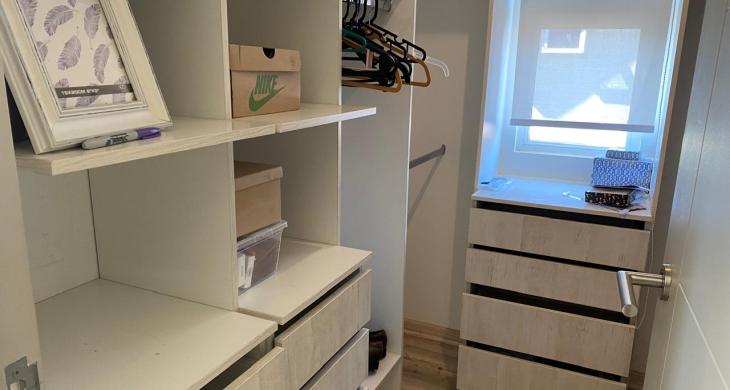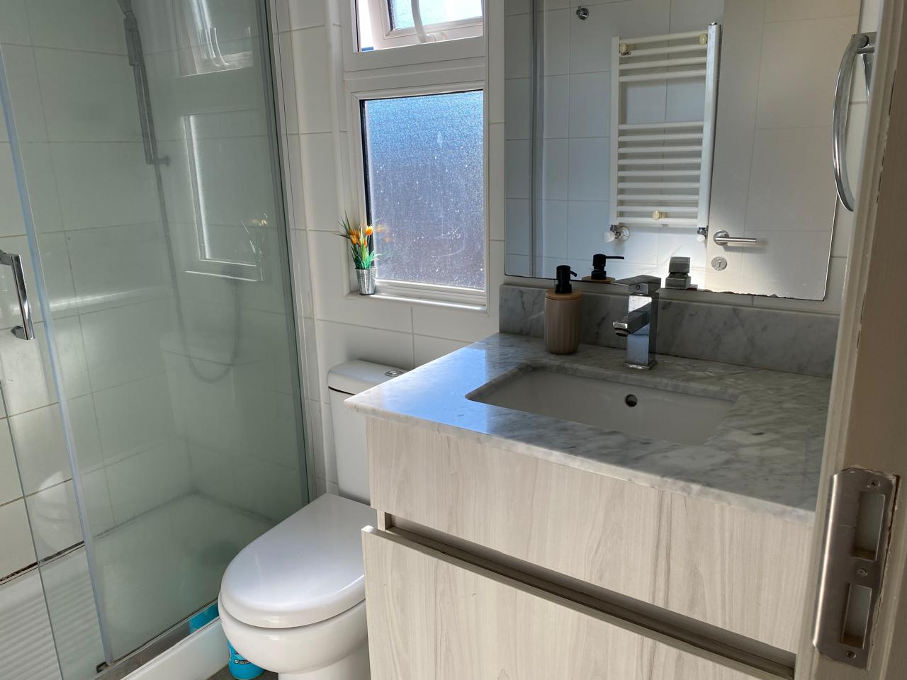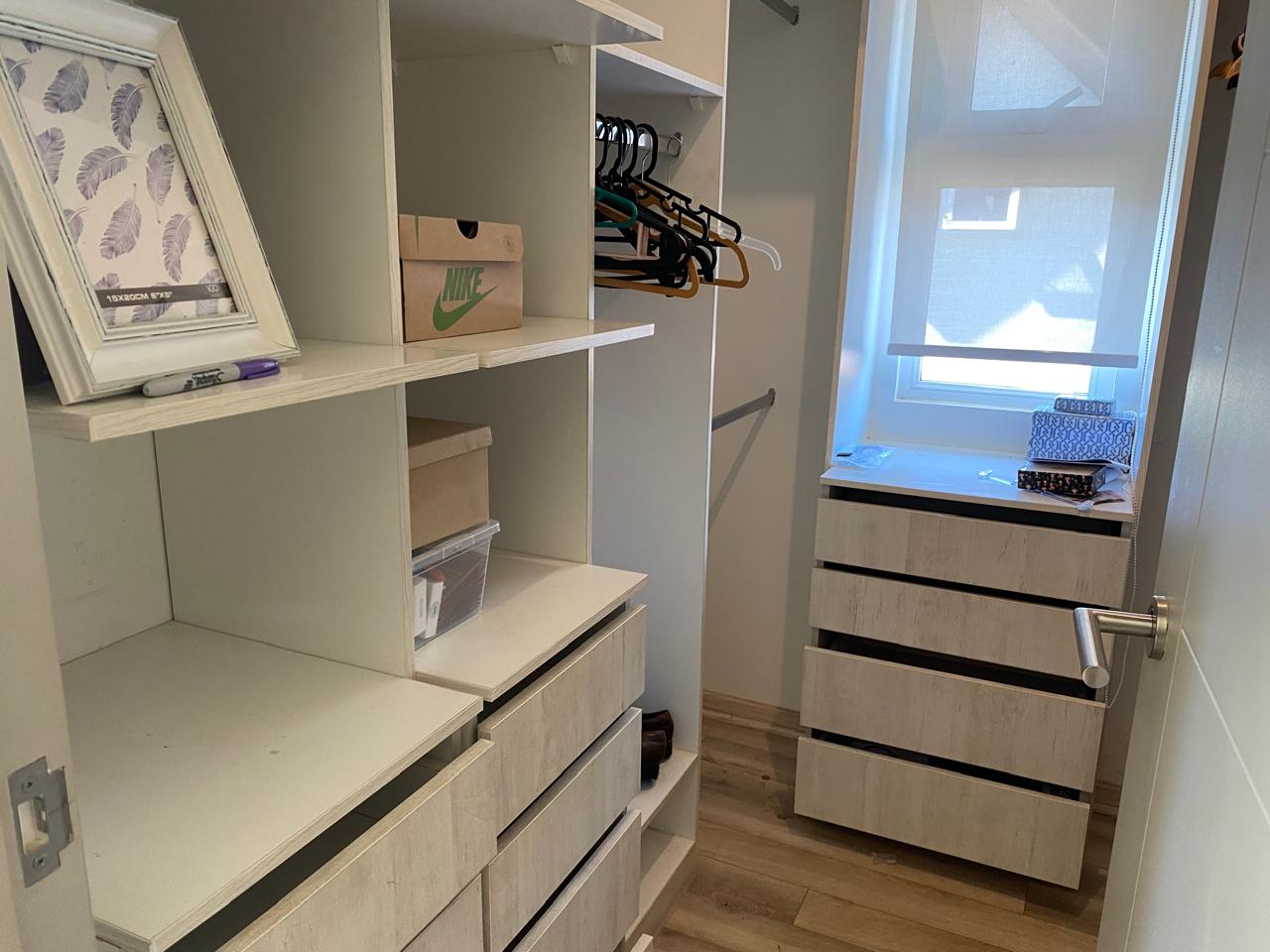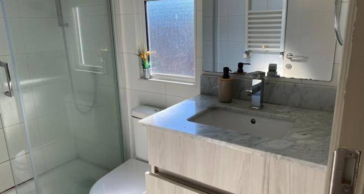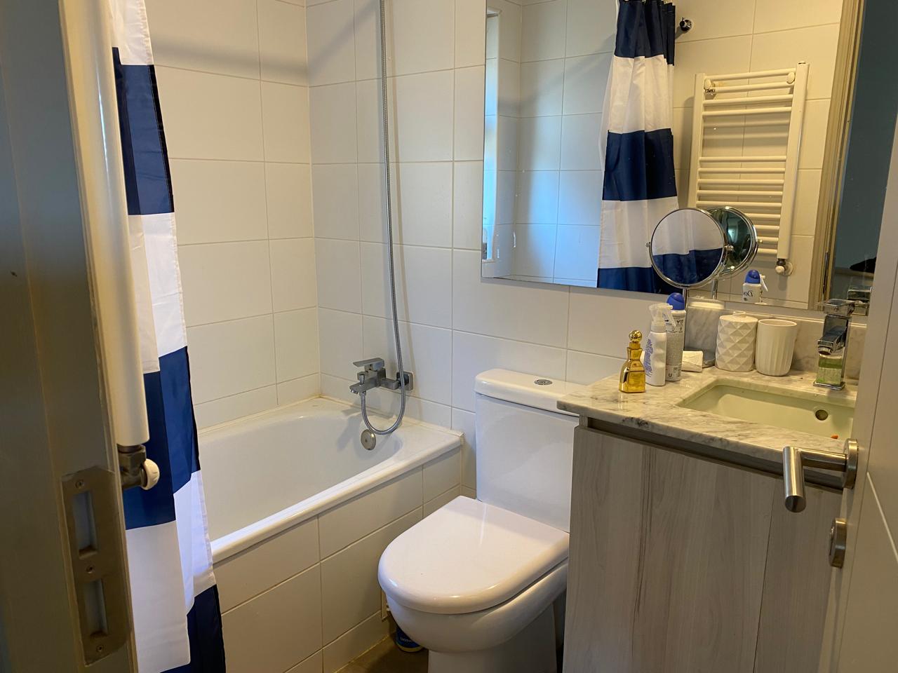 Dos dormitorios con closet, dos baños completos con lavamanos con cubierta de mármol, dormitorio principal en suite (con baño) y walk-in closet. Home office o sala de estar.