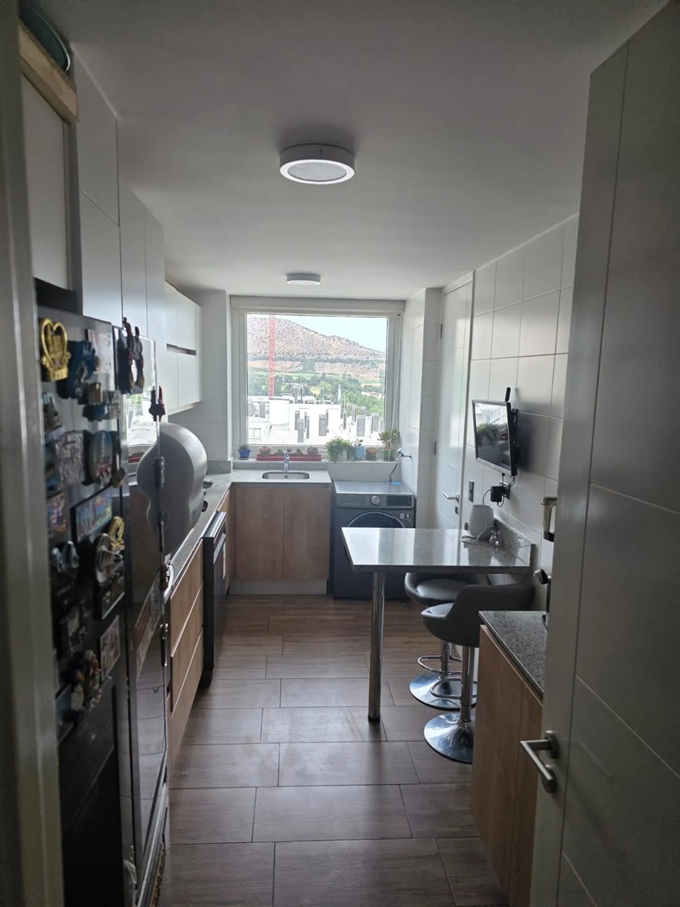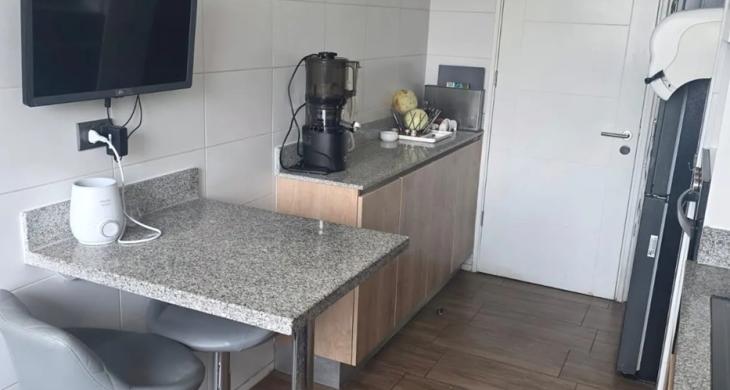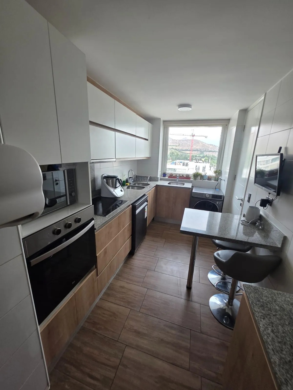 Cocina separada con equipamiento full electric, encimera vitrocerámica, horno, campana y muebles con cubierta de porcelanato. Comedor diario.