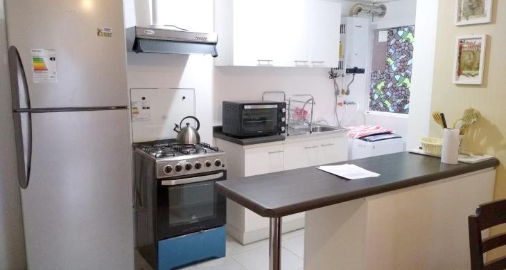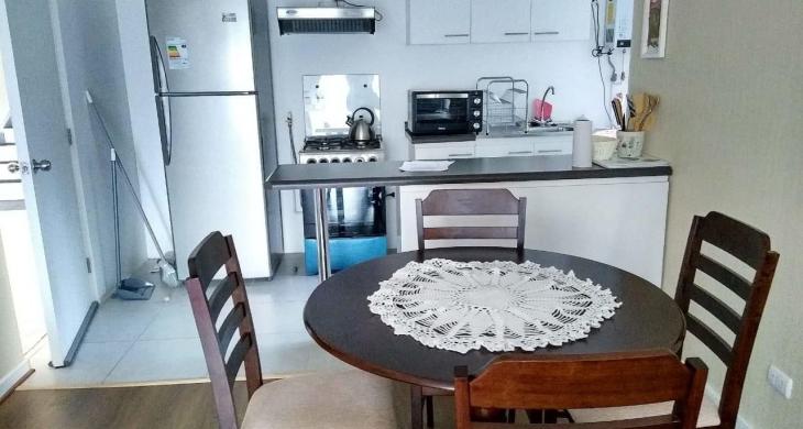 Living con sillón, televisor, mueble pata TV, cocina americana amoblada, refrigerador, cocina, campana, horno, lavadora, comedor con cuatro sillas, balcón.