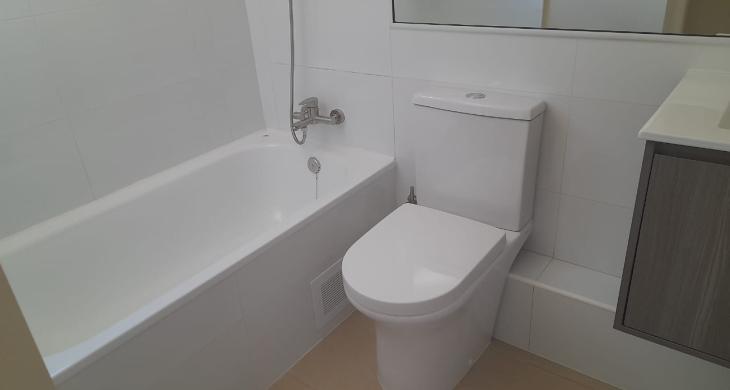 Un baño completo con termo e instalación para lavadora