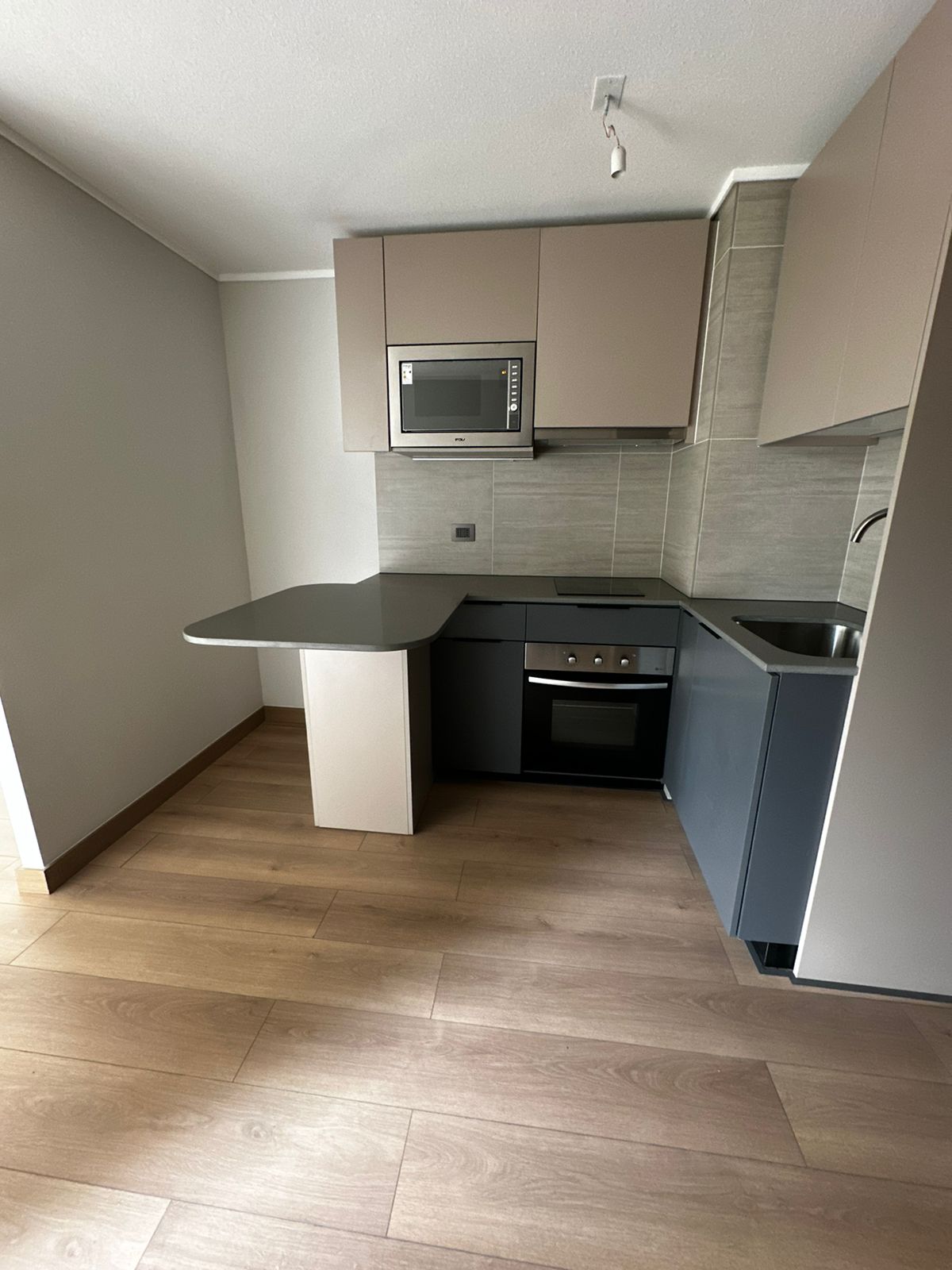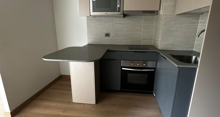 Tenemos en arriendo un hermoso departamento de un dormitorios con cocina americana amoblada y equipada con: Encimera eléctrica, horno eléctrico, microondas, refrigerador y freezer, cuenta con un balcón, ventanal termopanel, con por cortina y lámparas ya instaladas, sistema de alarma.