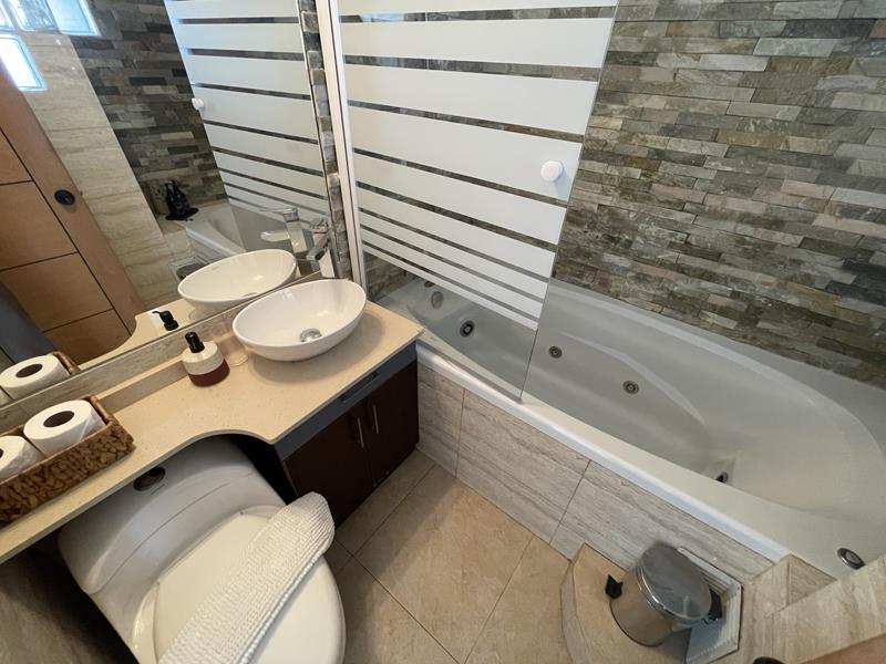 Baño completo equipado con bañera hidromasaje jacuzzi, muy buen tamaño con mueble en lavamanos.