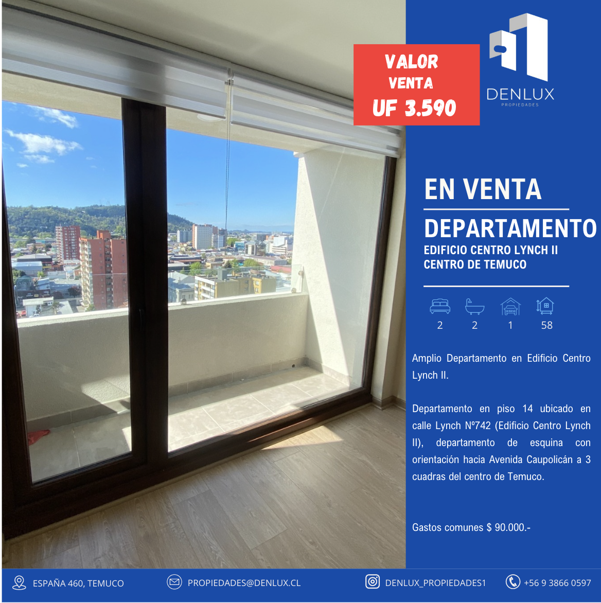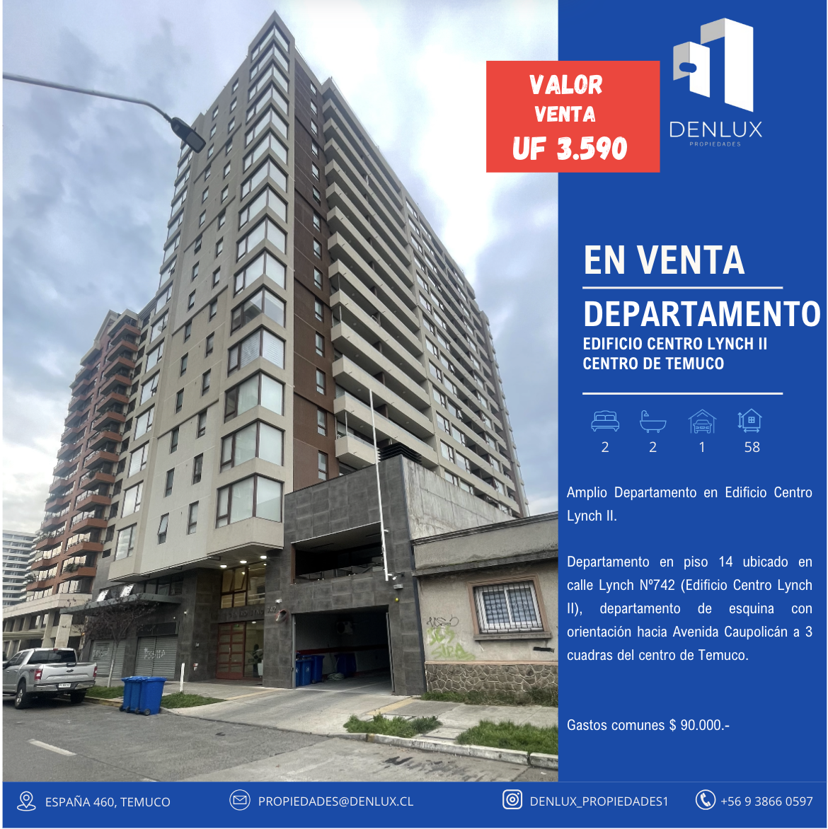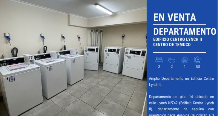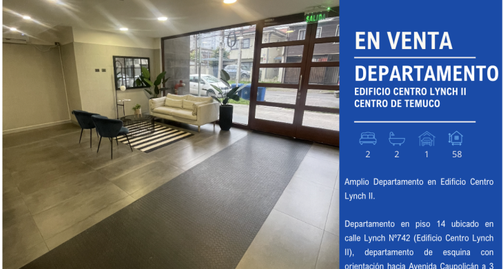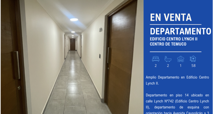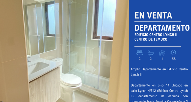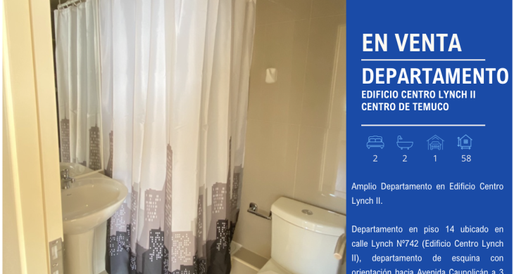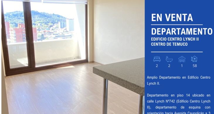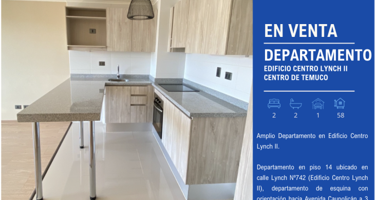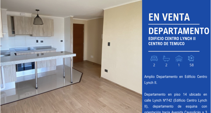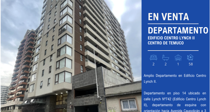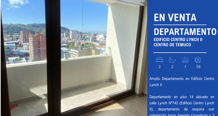 Departamento en piso 14 ubicado en calle Lynch Nº742 (Edificio Centro Lynch II), departamento de esquina con orientación hacia Avenida Caupolicán a 3 cuadras del centro de Temuco.