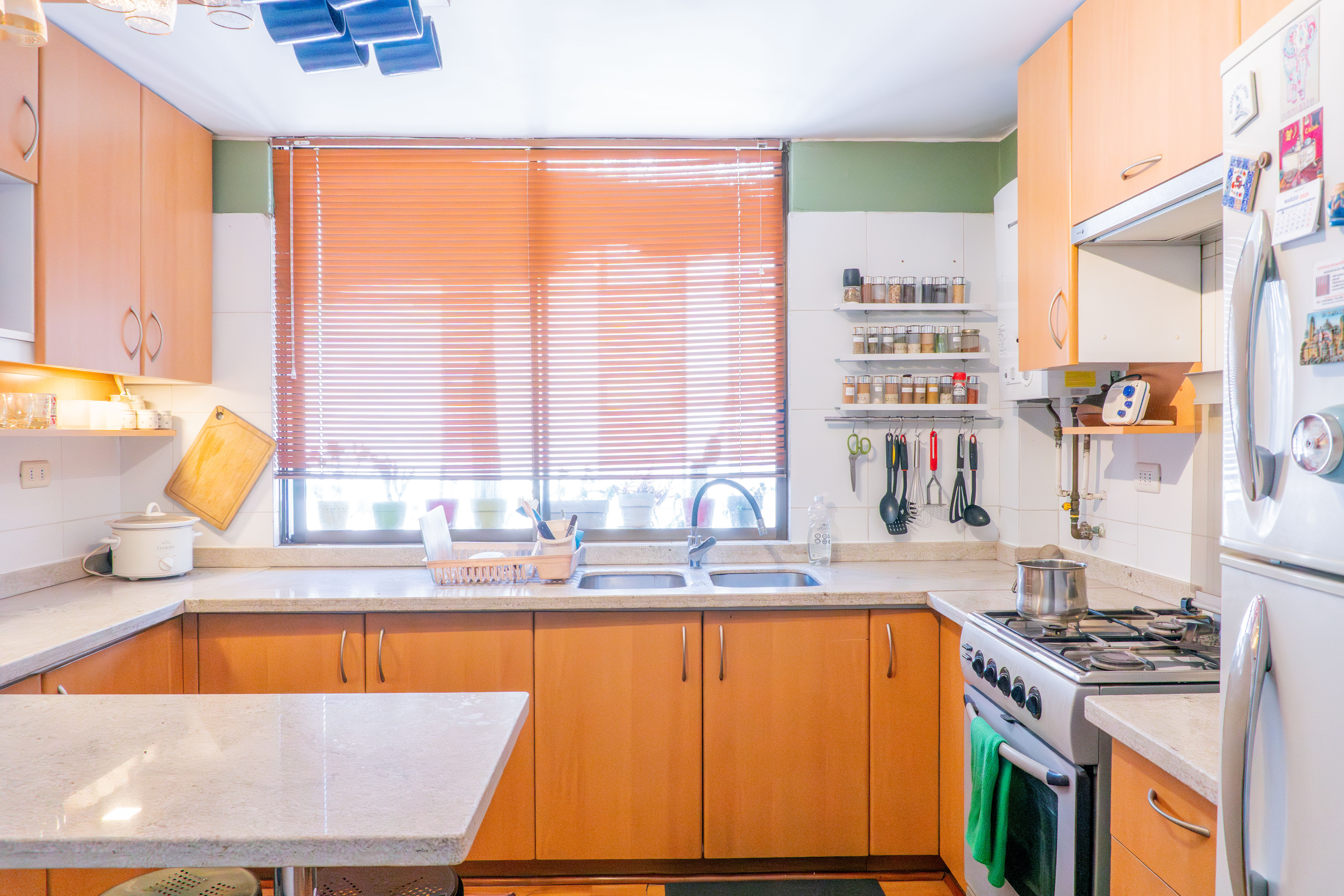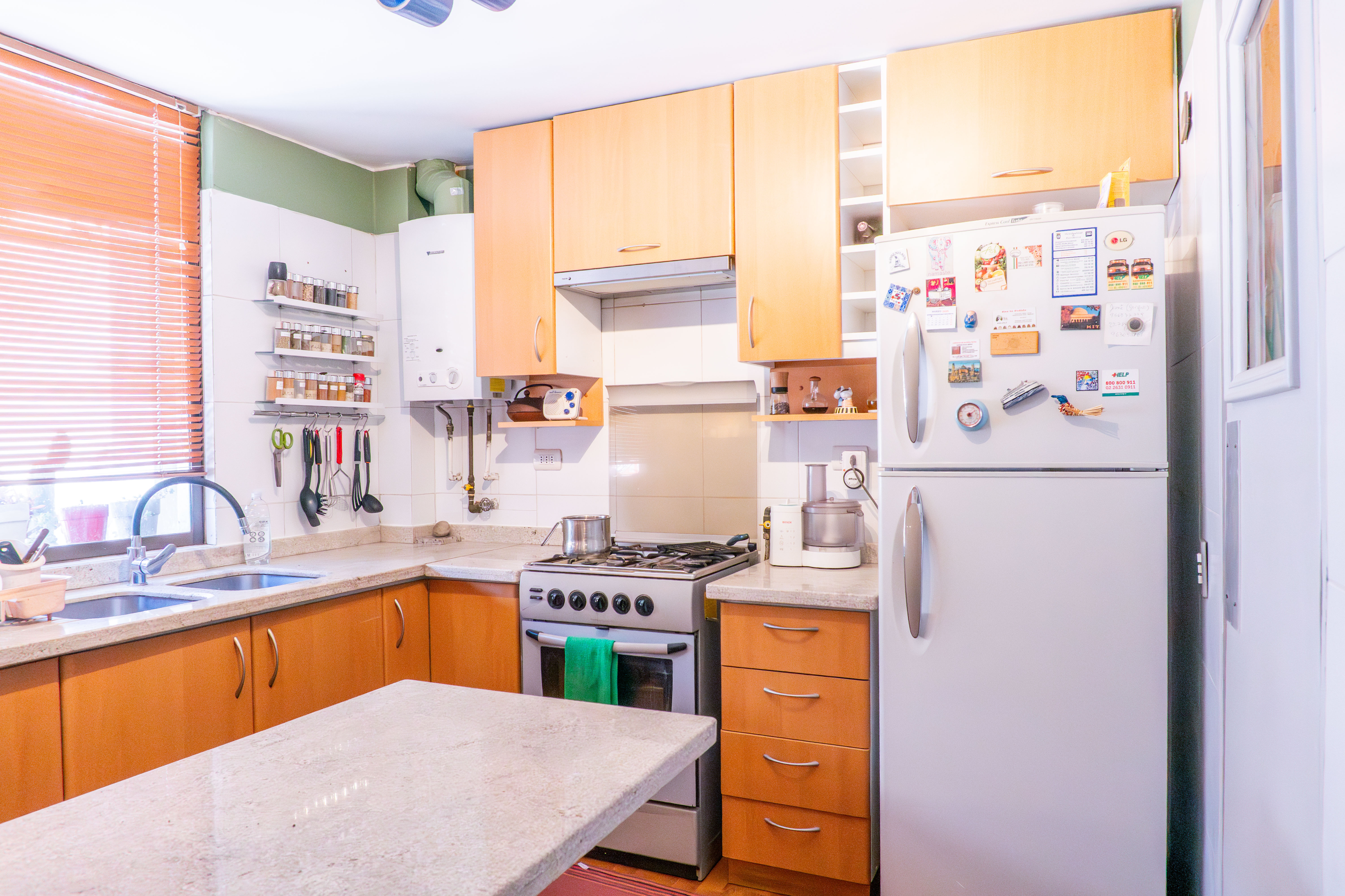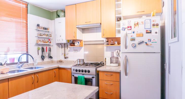 -Amplia Cocina con mesón al centro.