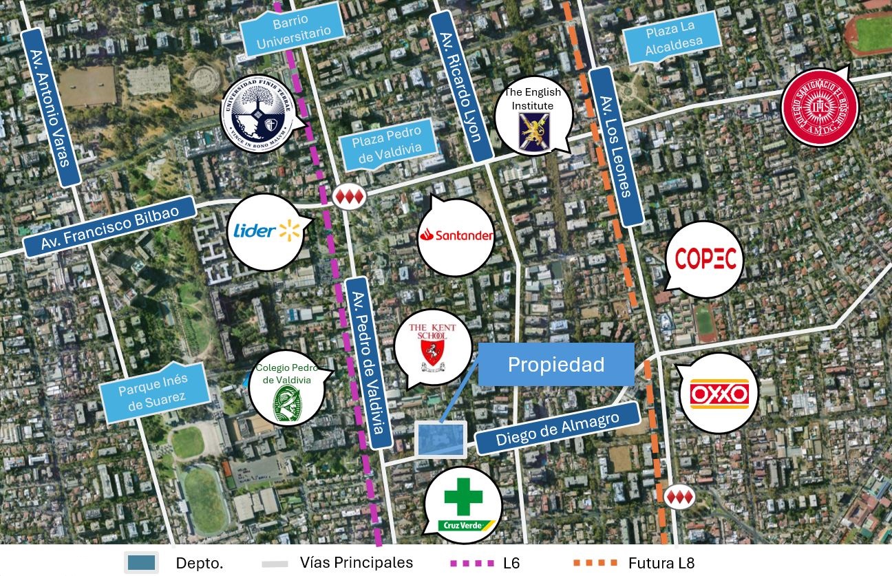 Barrio residencial en Providencia en una zona que destaca por su excelente conectividad de Metro y Transantiago por Avenida Pedro de Valdivia, equipamiento, adem[as de tranquilidad y áreas verdes. Revisar ultima imagen para ver equipamiento.