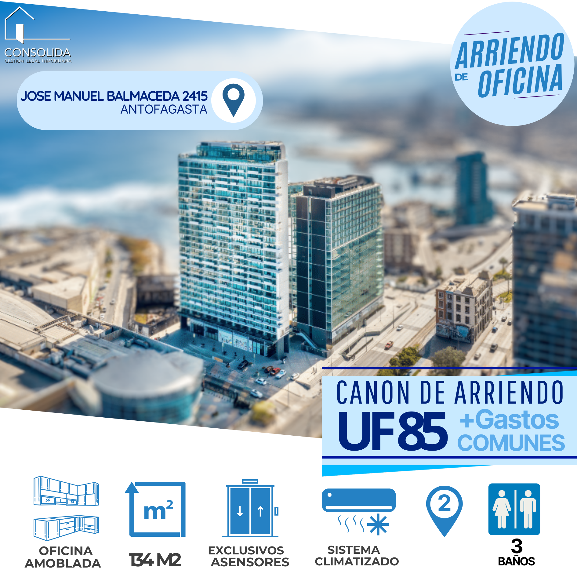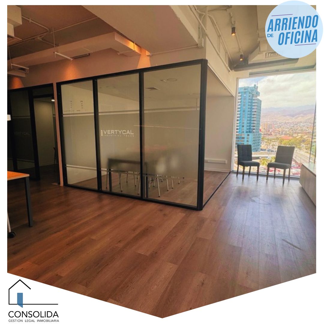 SE ARRIENDA Moderna Oficina con una ubicación privilegiada, rodeada por un conjunto de edificios como apartamentos, oficinas, comercio y equipamiento, en pleno centro de Antofagasta y con la mejor conectividad, convirtiendo al sector en el principal centro de negocios, residencial y hotelero del norte del país. En su alrrededor cuenta con Gimnasio, Cafés, Bancos, Tiendas exclusivas, servicios, Parking Publico, entre otros.