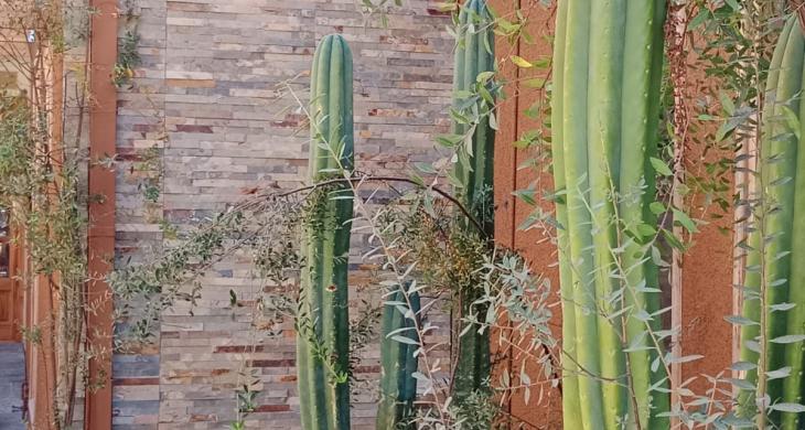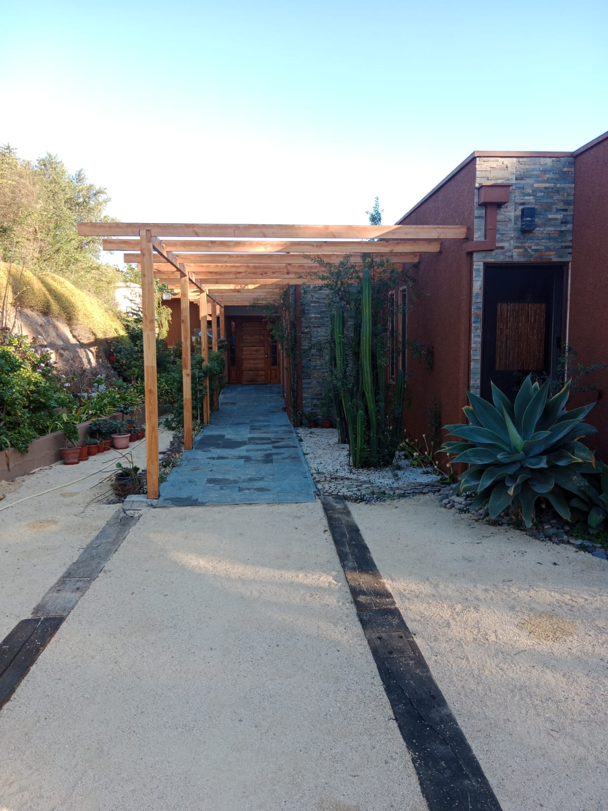 En la vivienda predomina la madera, presente en vigas, terraza y revestimientos, aportando calidez y un estilo rústico–moderno.