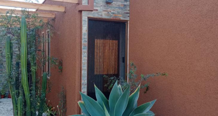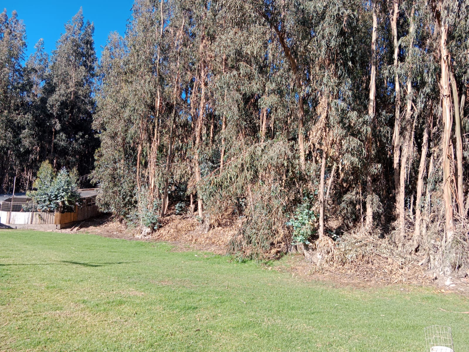 El terreno destaca por su privacidad, gracias a árboles de eucaliptos que rodean la propiedad. El acceso se realiza mediante un camino interior desde la reja hasta la casa.